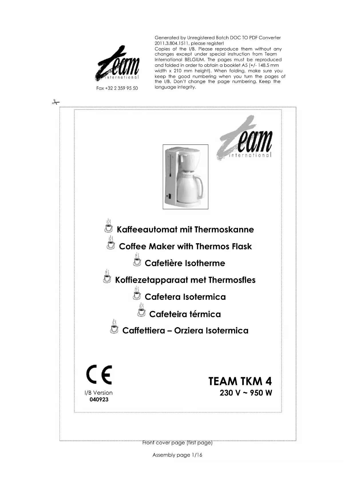 Nous vous conseillons de détartrer votre appareil régulièrement pour le garder en bon état. Pour cela, utilisez un détartrant pour cafetières électriques que vous trouverez dans le commerce et conformez-vous à son mode d’emploi. Ne placez aucune pièce de votre cafetière au lave-vaiselle mais lavez les parties amovibles à l’eau savonneuse en rinçant à l’eau claire. Pour les autres parties, faites usage d’un chiffon doux humide. Copies of the I/B. Please reproduce them without any changes except under special instruction from Team International BELGIUM. The pages must be reproduced and folded in order to obtain a booklet A5 (+/- 148.5 mm width x 210 mm height). When folding, make sure you keep the good numbering when you turn the pages of the I/B. Don’t change the page numbering. Keep the language integrity.