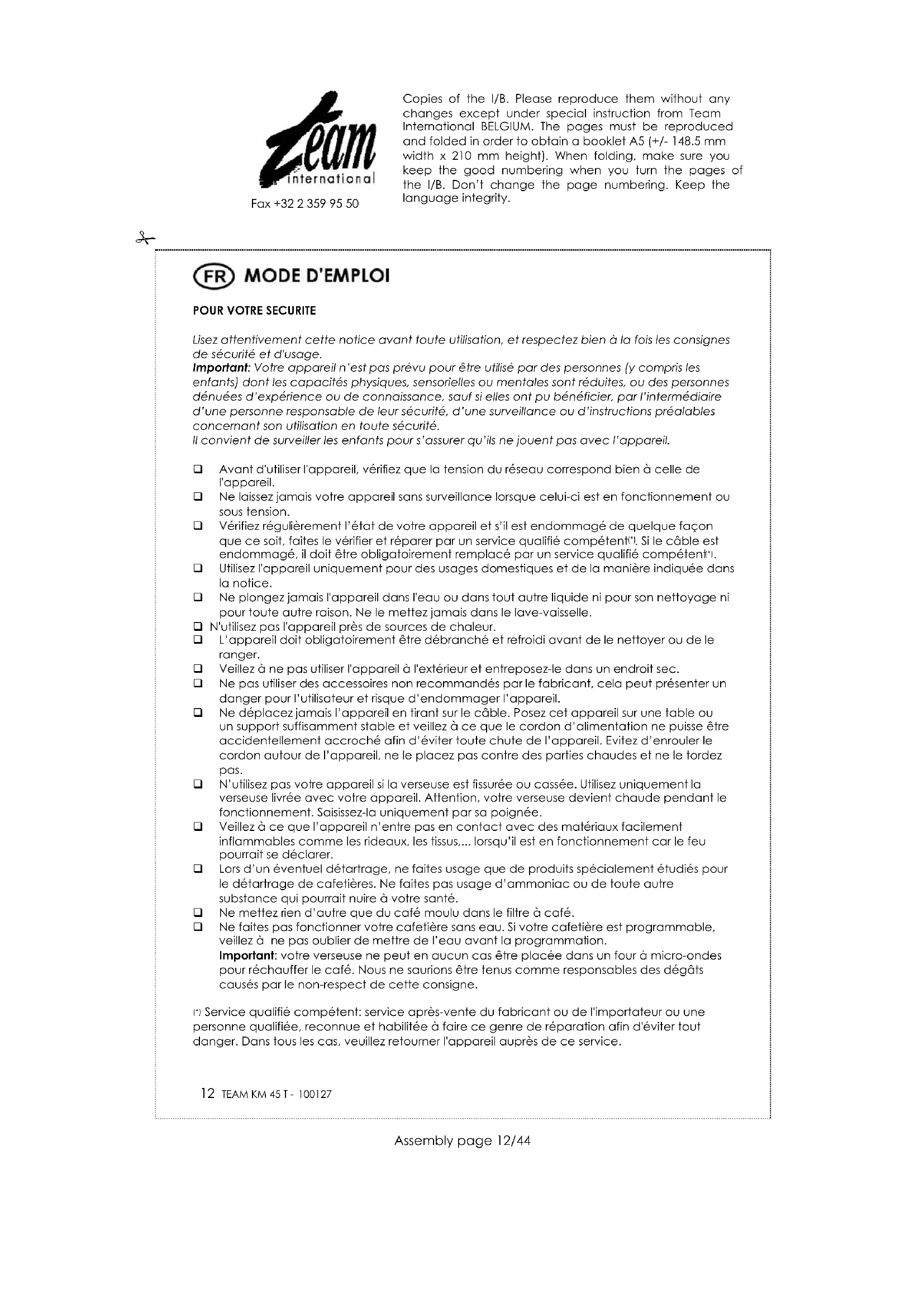 Afin de préserver notre environnement et notre santé, l’élimination en fin de vie des appareils électriques et électroniques doit se faire selon des règles bien précises et nécessite l’implication de chacun, qu’il soit fournisseur ou utilisateur. C’est pour cette raison que votre appareil, tel que le signale le symbole apposé sur sa plaque signalétique ou sur l'emballage, ne doit en aucun cas être jeté dans une poubelle publique ou privée destinée aux ordures ménagères. L'utilisateur a le droit de déposer l'appareil dans des lieux publics de collecte procédant à un tri sélectif des déchets pour être soit recyclé, soit réutilisé pour d’autres applications conformément à la directive. Copies of the I/B. Please reproduce them without any changes except under special instruction from Team International BELGIUM. The pages must be reproduced and folded in order to obtain a booklet A5 (+/- 148.5 mm width x 210 mm height). When folding, make sure you keep the good numbering when you turn the pages of the I/B. Don’t change the page numbering. Keep the language integrity.