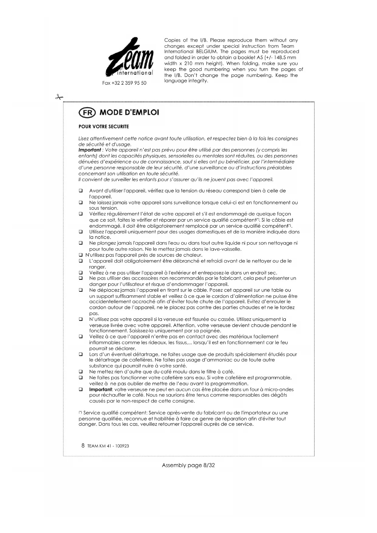Afin de préserver notre environnement et notre santé, l’élimination en fin de vie des appareils électriques et électroniques doit se faire selon des règles bien précises et nécessite l’implication de chacun, qu’il soit fournisseur ou utilisateur. C’est pour cette raison que votre appareil, tel que le signale le symbole apposé sur sa plaque signalétique ou sur l'emballage, ne doit en aucun cas être jeté dans une poubelle publique ou privée destinée aux ordures ménagères. L'utilisateur a le droit de déposer l'appareil dans des lieux publics de collecte procédant à un tri sélectif des déchets pour être soit recyclé, soit réutilisé pour d’autres applications conformément à la directive. Copies of the I/B. Please reproduce them without any changes except under special instruction from Team International BELGIUM. The pages must be reproduced and folded in order to obtain a booklet A5 (+/- 148.5 mm width x 210 mm height). When folding, make sure you keep the good numbering when you turn the pages of the I/B. Don’t change the page numbering. Keep the language integrity.