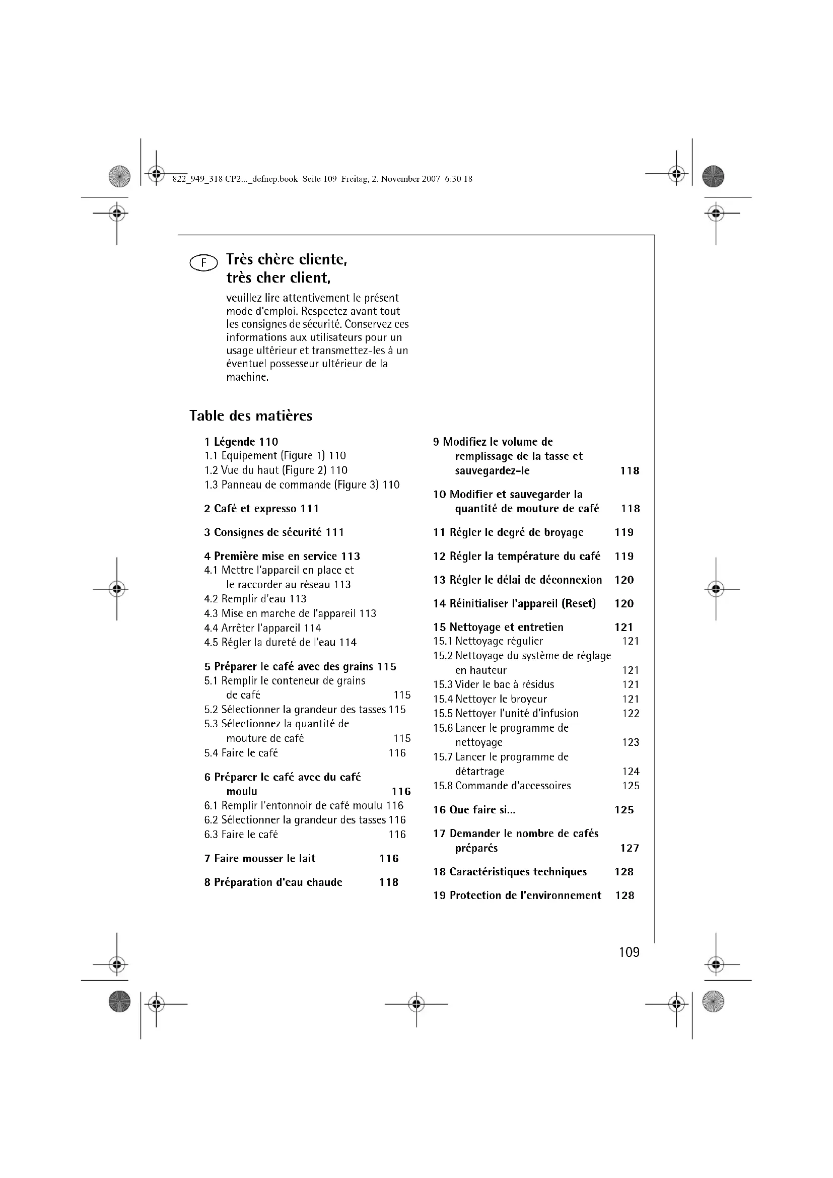 16 Que faire si... 125 17 Demander le nombre de cafés préparés 127 18 Caractéristiques techniques 128 19 Protection de l’environnement 128 822_949_318 CP2..._defnep.book Seite 109 Freitag, 2. November 2007 6:30 18f
