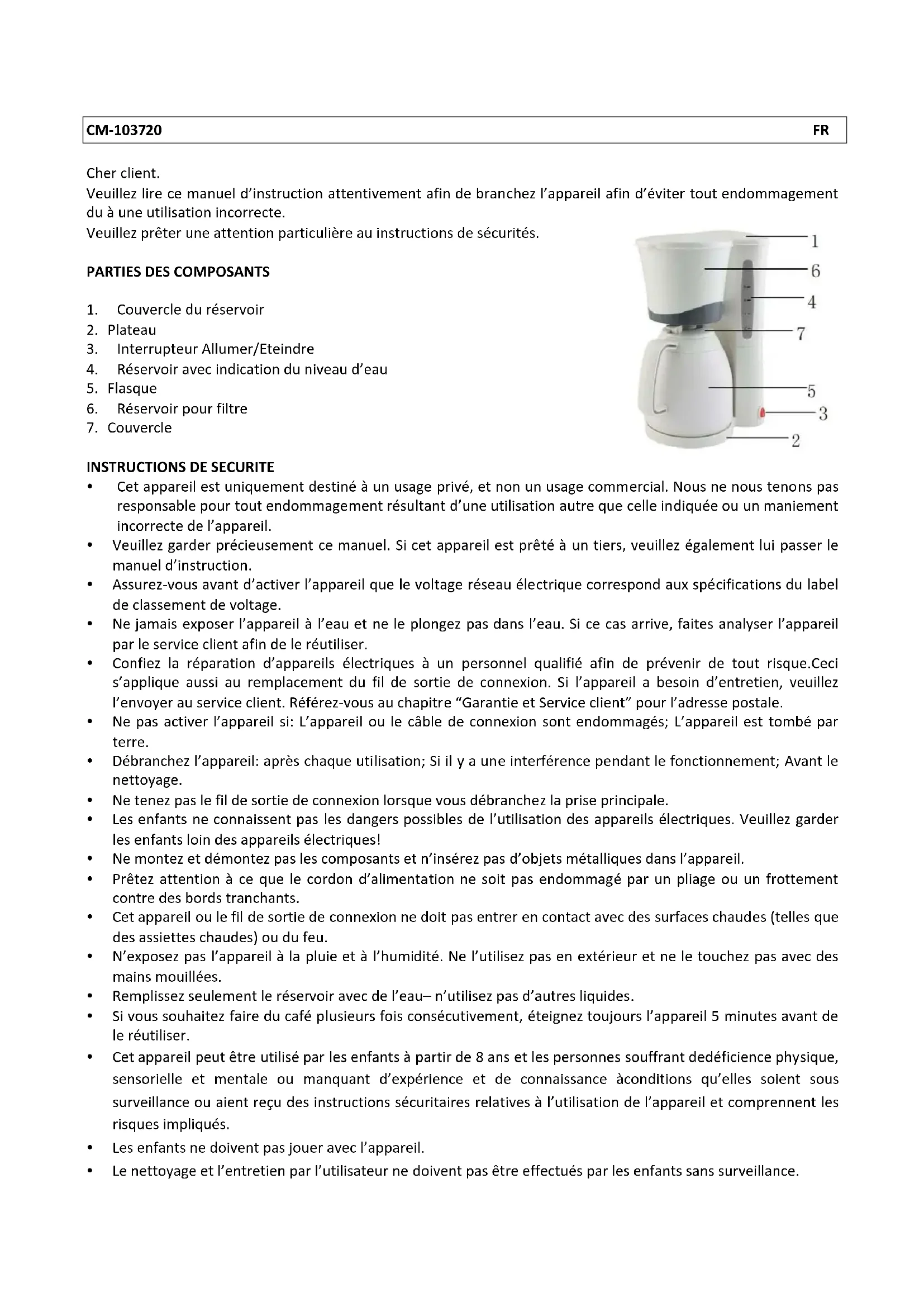 Si you souhaitez faire du café plusieurs fois consecutivement, eteignez always 5 minutes avant de le réutiliser. - Cet apparéil peut être utilisé par les enfants à partir de 8 ans et les personnes souffrant dedéficience physique, sensorielle et mentale ou manquant d'expérience et de connaissance à conditions qu'elles soient sous surveillance ou aient reçu des instructions sécuritaires relatives à l'utilisation de l' apparéil et comprend les risques impliqués.
