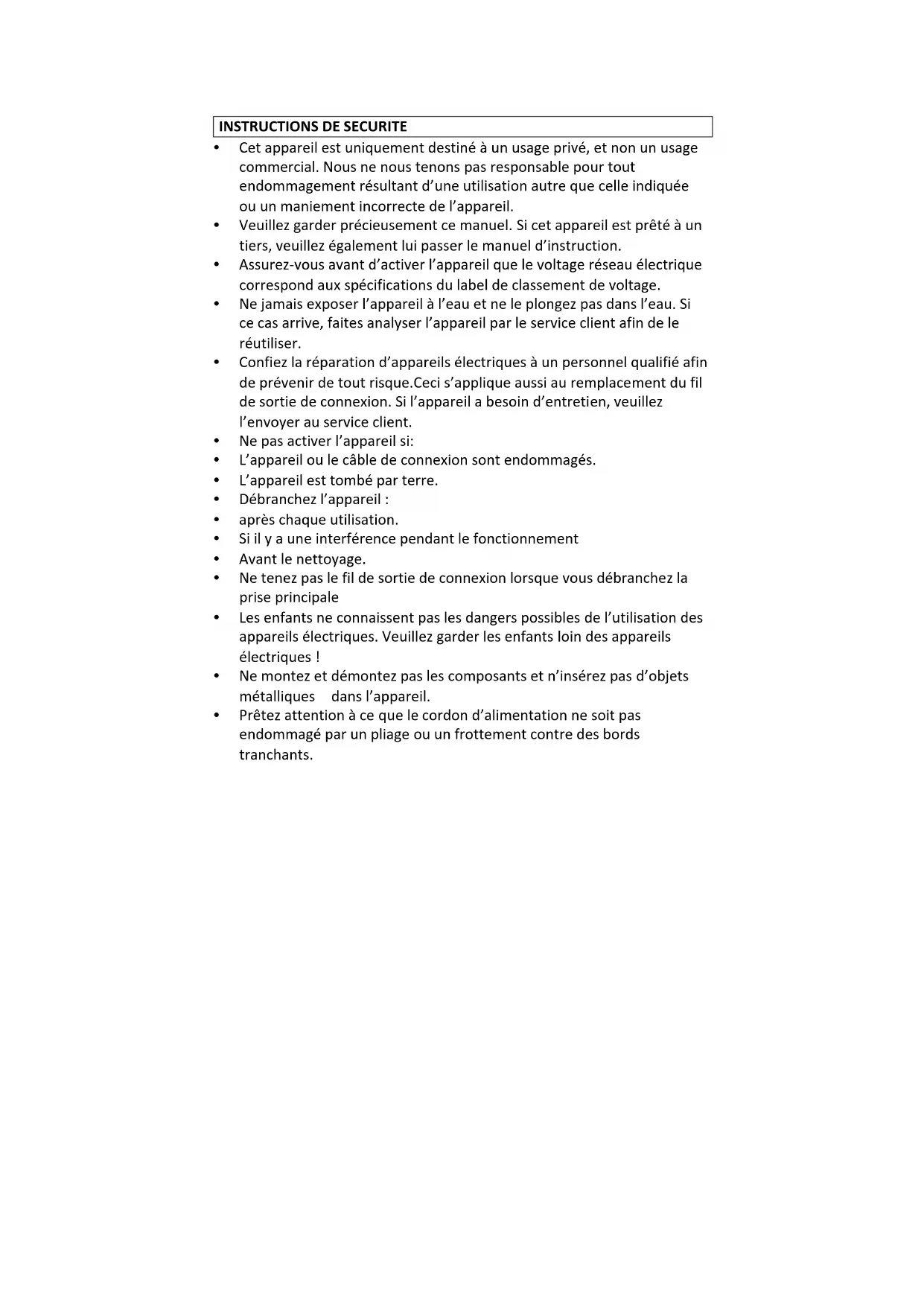 INSTRUCTIONSDESECURITE y Cetappareilestuniquementdestinéàunusageprivé,etnonunusage commercial.Nousnenoustenonspasresponsablepourtout endommagementrésulta ntd’uneutilisationautrequecelleindiquée ouunmaniementincorrectedel’appar eil. y Veuillezgarderprécieusementcemanuel.Sicetappareilestprêtéàun tiers,veuillezégalementluipasserlemanueld’instruction. y Assurez‐vousavantd’activerl’appareilquelevoltageréseauélectrique correspondauxspécificationsdulabeldeclassementdevoltage. y Nejamaisexposerl’appareilàl’eauetneleplongezpasdansl’eau.Si cecasarrive,faitesanalyserl’appareilparleserviceclientafindele réutiliser. y Confiezlaréparationd’appareilsélectriquesàunpersonnelqualifiéafin deprévenirdetoutrisque.Cecis’appliqueaussiauremplacementdufil desortiedeconnexion.Sil’appareilabesoind’entretien,veuillez l’envoyerauserviceclient. y Nepasactiverl’appareilsi: y L’appareiloulecâbledeconnexionsontendommagés. y L’appareilesttombéparterre. y Débranchezl’appareil: y aprèschaqueutilisation. y Siilyauneinterférencependantlefonctionnem ent y Avantlenettoyage. y Netenezpaslefildesortiedeconnexionlorsquevousdébranchezla priseprincipale y Lesenfantsneconnaissentpaslesdangers possiblesdel’utilisationdes appareilsélectriques.Veuillezgarderlesenfantsloindesappareils électriques! y Nemontezetdémontezpaslescomposantsetn’insé rezpasd’objets métalliquesdansl’appareil. y Prêtezattentionàcequelecordond’alimentationnesoitpas endommagéparunpliageouunfrottementcontredesbords tranchants.y Cetappareiloulefildesortiedeconnexionnedoitpasentreren contactavecdessurfaceschaudes(tellesquedesassietteschaudes)ou dufeu. y N’exposezpasl’appareilàlapluieetàl’humidité.Nel’utilisezpasen extérieuretneletouchezpasavecdesmainsmouillées. y Remplissezseulementleréservoiravecdel’eau–n’utilisezpasd’autres liquides. y Sivoussouhaitezfaireducaféplusieursfoisconsécutivement,éteignez toujoursl’appareil5minutesavantdeleréutiliser. y Cetappareiln'estpasdestinéàêtreutilisépardespersonnes(y comprisdesenfants)auxcapacitésphysiques, sensorielles oumentales réduitesounedisposantpasdel'expérienceetdesconnaissances nécessairesàmoinsqu'ellesnesoientplacéessouslasurveillanceet instruitesparunepersonneresponsabledeleursécurité.Lesen fants doiventêtresurveilléspours'assurerqu'ilsnejouentpasavec l'appareil. y S’ilestendommagé,lecordond’alimentationdoitêtreremplacéparle fabricant,sesagentsderéparationouunepersonnequalifiéeafin d’évitertoutrisqued’accident. y L’appareil ne doit pas être mis en marche au moyen d’une prise minuteurexterneouaumoyend’unsystèmedetélécommandeséparé. y Veillezàcequelesenfantsnejouentpasavecl’appareil. y Placezl’appareilsurunesurfaceplate,sècheetrésistanteàlachaleur. y Nelaissezjamaisl'appareilsanssurveillancelorsqu'ilestenmarche. y Cet appareil est conçu pour être utilisé dans les ménages et dans les lieuxsimilairesnotamment: - Lescuisinesdupersonneldanslesmagasins,lesbureauxetautres lieuxdeservice; - Lesfermes; - par des clients dans des hôtels, des motels et autres types d'environnementrésidentiel; - enpl usdesenvironnementsdutypeauberge,bistrot,café,etc.