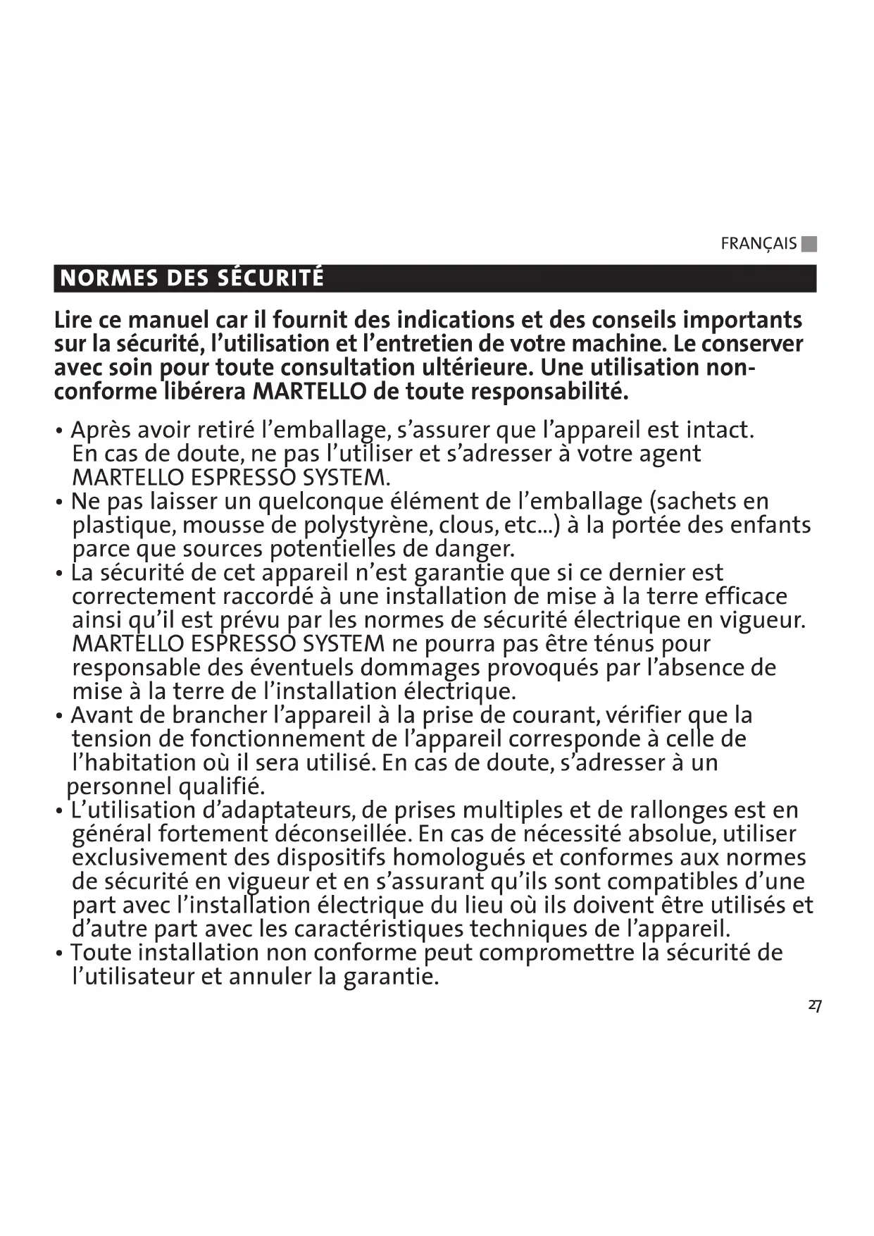 - La sécurité de cet appareil n’est garantie que si ce dernier est correctement raccordé à une installation de mise à la terre efficace ainsi qu’il est prévu par les normes de sécurité électrique en vigueur. MARTELLO ESPRESSO SYSTEM ne pourra pas être ténus pour responsable des éventuels dommages provoqués par l’absence de mise à la terre de l’installation électrique.