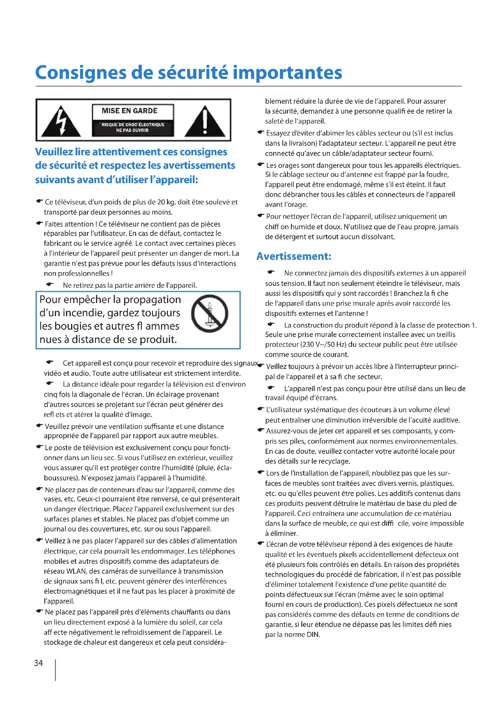 Veuillez lire attentivement ces consignes de sécurité et respectez les avertissements suivants avant d’utiliser l’appareil: Ce téléviseur, d’un poids de plus de 20 kg, doit être soulevé et transporté par deux personnes au moins. Faites attention ! Ce téléviseur ne contient pas de pièces réparables par l‘utilisateur. En cas de défaut, contactez le fabricant ou le service agréé. Le contact avec certaines pièces à l’intérieur de l’appareil peut présenter un danger de mort. La garantie n’est pas prévue pour les défauts issus d’interactions non professionnelles ! Ne retirez pas la partie arrière de l‘appareil. Pour empêcher la propagation d’un incendie, gardez toujours les bougies et autres ammes nues à distance de se produit. Cet appareil est conçu pour recevoir et reproduire des signaux vidéo et audio. Toute autre utilisateur est strictement interdite. La distance idéale pour regarder la télévision est d’environ cinq fois la diagonale de l‘écran. Un éclairage provenant d’autres sources se projetant sur l’écran peut générer des re ets et atérer la qualité d‘image. Veuillez prévoir une ventilation su sante et une distance appropriée de l’appareil par rapport aux autre meubles. Le poste de télévision est exclusivement conçu pour foncti- onner dans un lieu sec. Si vous l’utilisez en extérieur, veuillez vous assurer qu’il est protéger contre l’humidité (pluie, écla- boussures). N’exposez jamais l’appareil à l’humidité. Ne placez pas de conteneurs d’eau sur l’appareil, comme des vases, etc. Ceux-ci pourraient être renversé, ce qui présenterait un danger électrique. Placez l’appareil exclusivement sur des surfaces planes et stables. Ne placez pas d’objet comme un journal ou des couvertures, etc. sur ou sous l’appareil. Veillez à ne pas placer l’appareil sur des câbles d’alimentation électrique, car cela pourrait les endommager. Les téléphones mobiles et autres dispositifs comme des adaptateurs de réseau WLAN, des caméras de surveillance à transmission de signaux sans l, etc. peuvent générer des interférences électromagnétiques et il ne faut pas les placer à proximité de l‘appareil. Ne placez pas l’appareil près d’éléments chau ants ou dans un lieu directement exposé à la lumière du soleil, car cela a ecte négativement le refroidissement de l‘appareil. Le stockage de chaleur est dangereux et cela peut considéra- blement réduire la durée de vie de l‘appareil. Pour assurer la sécurité, demandez à une personne quali ée de retirer la saleté de l‘appareil. Essayez d’éviter d’abimer les câbles secteur ou (s’il est inclus dans la livraison) l’adaptateur secteur. L’appareil ne peut être connecté qu’avec un câble/adaptateur secteur fourni. Les orages sont dangereux pour tous les appareils électriques. Si le câblage secteur ou d’antenne est frappé par la foudre, l’appareil peut être endomagé, même s’il est éteint. Il faut donc débrancher tous les câbles et connecteurs de l’appareil avant l‘orage. Pour nettoyer l’écran de l’appareil, utilisez uniquement un chi on humide et doux. N’utilisez que de l’eau propre, jamais de détergent et surtout aucun dissolvant.