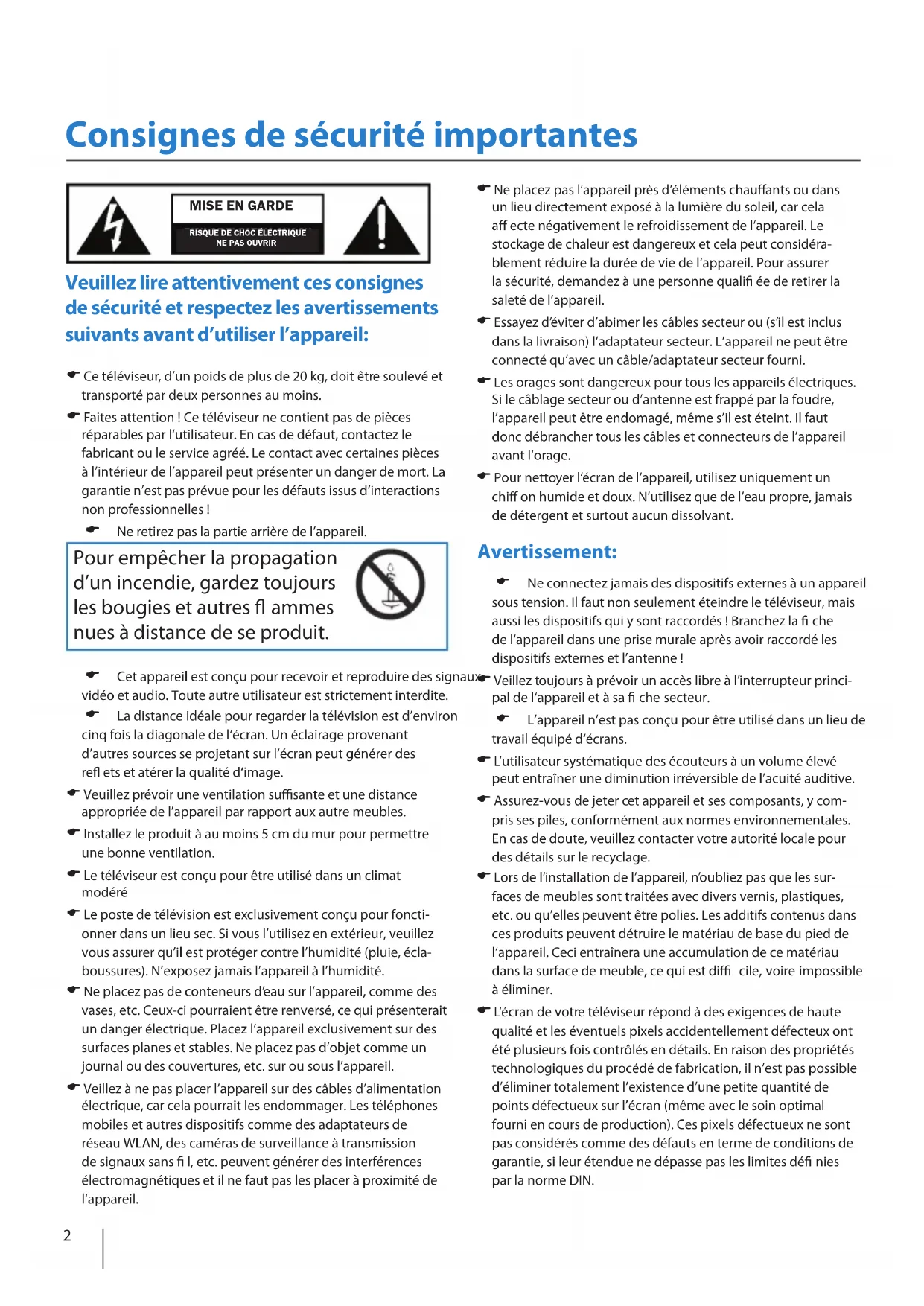 Veuillez lire attentivement ces consignes de sécurité et respectez les avertissements suivants avant d’utiliser l’appareil: Ce téléviseur, d’un poids de plus de 20 kg, doit être soulevé et transporté par deux personnes au moins. Faites attention ! Ce téléviseur ne contient pas de pièces réparables par l‘utilisateur. En cas de défaut, contactez le fabricant ou le service agréé. Le contact avec certaines pièces à l’intérieur de l’appareil peut présenter un danger de mort. La garantie n’est pas prévue pour les défauts issus d’interactions non professionnelles ! Ne retirez pas la partie arrière de l‘appareil. Pour empêcher la propagation d’un incendie, gardez toujours les bougies et autres ammes nues à distance de se produit. Cet appareil est conçu pour recevoir et reproduire des signaux vidéo et audio. Toute autre utilisateur est strictement interdite. La distance idéale pour regarder la télévision est d’environ cinq fois la diagonale de l‘écran. Un éclairage provenant d’autres sources se projetant sur l’écran peut générer des re ets et atérer la qualité d‘image. Veuillez prévoir une ventilation su sante et une distance appropriée de l’appareil par rapport aux autre meubles. Installez le produit à au moins 5 cm du mur pour permettre une bonne ventilation. Le téléviseur est conçu pour être utilisé dans un climat modéré Le poste de télévision est exclusivement conçu pour foncti- onner dans un lieu sec. Si vous l’utilisez en extérieur, veuillez vous assurer qu’il est protéger contre l’humidité (pluie, écla- boussures). N’exposez jamais l’appareil à l’humidité. Ne placez pas de conteneurs d’eau sur l’appareil, comme des vases, etc. Ceux-ci pourraient être renversé, ce qui présenterait un danger électrique. Placez l’appareil exclusivement sur des surfaces planes et stables. Ne placez pas d’objet comme un journal ou des couvertures, etc. sur ou sous l’appareil. Veillez à ne pas placer l’appareil sur des câbles d’alimentation électrique, car cela pourrait les endommager. Les téléphones mobiles et autres dispositifs comme des adaptateurs de réseau WLAN, des caméras de surveillance à transmission de signaux sans l, etc. peuvent générer des interférences électromagnétiques et il ne faut pas les placer à proximité de l‘appareil. Ne placez pas l’appareil près d’éléments chau ants ou dans un lieu directement exposé à la lumière du soleil, car cela a ecte négativement le refroidissement de l‘appareil. Le stockage de chaleur est dangereux et cela peut considéra- blement réduire la durée de vie de l‘appareil. Pour assurer la sécurité, demandez à une personne quali ée de retirer la saleté de l‘appareil. Essayez d’éviter d’abimer les câbles secteur ou (s’il est inclus dans la livraison) l’adaptateur secteur. L’appareil ne peut être connecté qu’avec un câble/adaptateur secteur fourni. Les orages sont dangereux pour tous les appareils électriques. Si le câblage secteur ou d’antenne est frappé par la foudre, l’appareil peut être endomagé, même s’il est éteint. Il faut donc débrancher tous les câbles et connecteurs de l’appareil avant l‘orage. Pour nettoyer l’écran de l’appareil, utilisez uniquement un chi on humide et doux. N’utilisez que de l’eau propre, jamais de détergent et surtout aucun dissolvant.