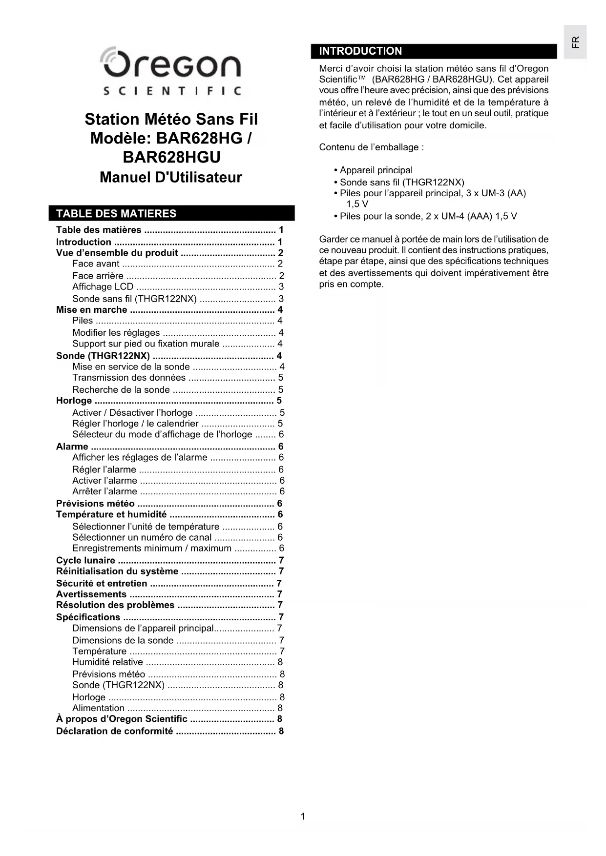 - Déclaration de conformité INTRODUCTION Merci d’avoir choisi la station météo sans fil d’Oregon Scientific™ (BAR628HG / BAR628HGU). Cet appareil vous offre l’heure avec précision, ainsi que des prévisions météo, un relevé de l’humidité et de la température à l’intérieur et à l’extérieur ; le tout en un seul outil, pratique et facile d’utilisation pour votre domicile. Contenu de l’emballage : p. 8