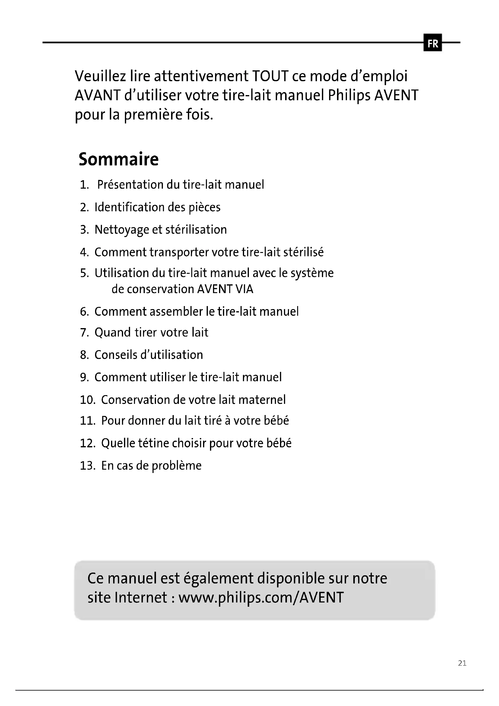 Veuillez lire attentivement TOUT ce mode d'emploi AVANT d'utiliser votre tire-lait manuel Philips AVENT pour la première fois.