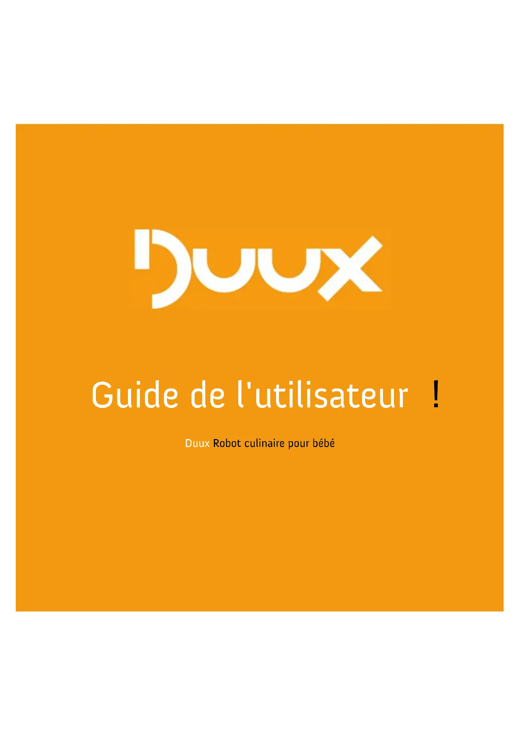 Guide de l'utilisateur ! Duux Robot culinaire pour bébéFélicitations ! Nous vous félicitons d’avoir acheté cet article Duux ! Pour pouvoir utiliser nos services en ligne, veuillez enregistrer votre produit et sa garantie sur www.duux.com/register Les articles électroniques pour bébé créés par Duux allient fiabilité, beauté du design et facilité d'utilisation pour simplifier la vie des parents qui pourront ainsi mieux profiter de ces moments magiques avec bébé. Le robot culinaire pour bébé Duux vous permet de préparer les plus délicieux repas pour votre bébé. Cuisez à la vapeur, mixer, chauffer et réchauffer le repas préféré de votre bébé en quelques minutes. La fonction stérilisateur s'utilise également pour stériliser les biberons et chauffer les repas et les biberons. Veuillez lire attentivement ce manuel pour pouvoir utiliser au mieux le robot culinaire de votre bébé.Table des matières ! 1 Aperçu du produit Robot culinaire pour bébé Caractéristiques techniques