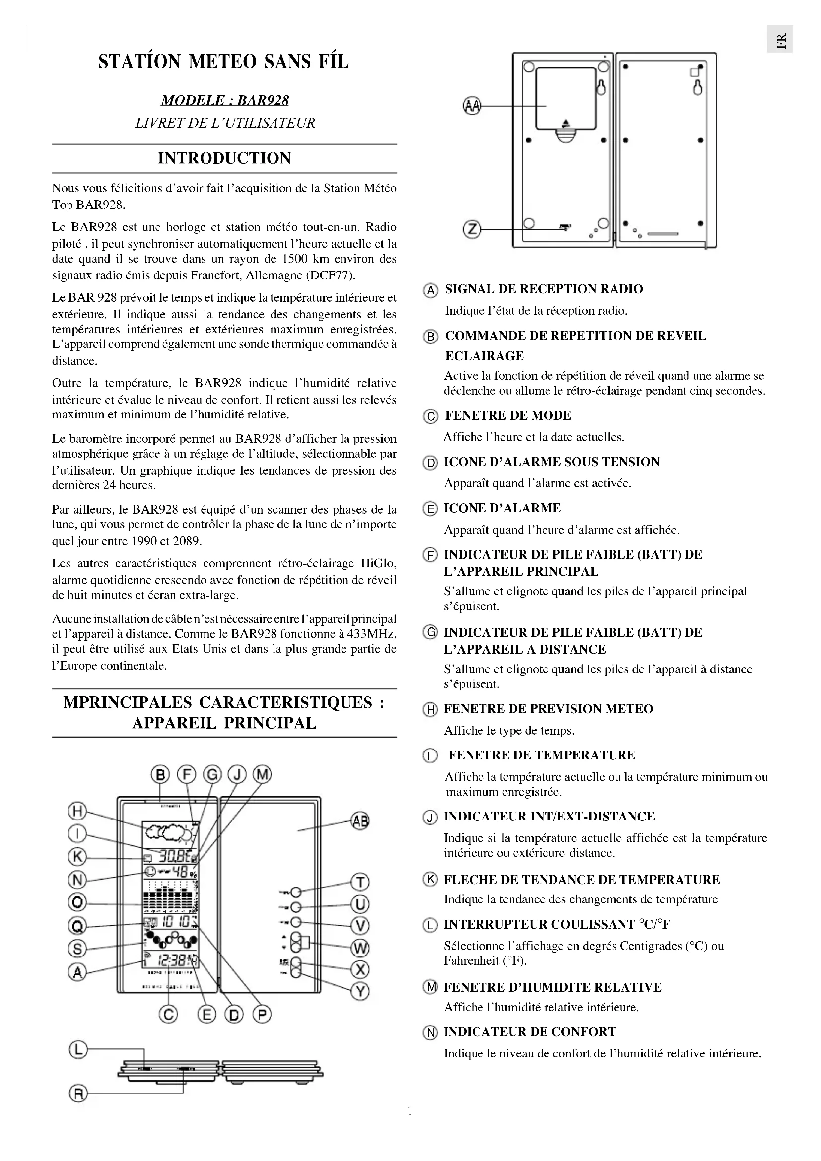 INTRODUCTION Nous vous félicitions d’avoir fait l’acquisition de la Station Météo Top BAR928. Le BAR928 est une horloge et station météo tout-en-un. Radio piloté , il peut synchroniser automatiquement l’heure actuelle et la date quand il se trouve dans un rayon de 1500 km environ des signaux radio émis depuis Francfort, Allemagne (DCF77). Le BAR 928 prévoit le temps et indique la température intérieure et extérieure. Il indique aussi la tendance des changements et les températures intérieures et extérieures maximum enregistrées. L’appareil comprend également une sonde thermique commandée à distance. Outre la température, le BAR928 indique l’humidité relative intérieure et évalue le niveau de confort. Il retient aussi les relevés maximum et minimum de l’humidité relative. Le baromètre incorporé permet au BAR928 d’afficher la pression atmosphérique grâce à un réglage de l’altitude, sélectionnable par l’utilisateur. Un graphique indique les tendances de pression des dernières 24 heures. Par ailleurs, le BAR928 est équipé d’un scanner des phases de la lune, qui vous permet de contrôler la phase de la lune de n’importe quel jour entre 1990 et 2089. Les autres caractéristiques comprennent rétro-éclairage HiGlo, alarme quotidienne crescendo avec fonction de répétition de réveil de huit minutes et écran extra-large. Aucune installation de câble n’est nécessaire entre l’appareil principal et l’appareil à distance. Comme le BAR928 fonctionne à 433MHz, il peut être utilisé aux Etats-Unis et dans la plus grande partie de l’Europe continentale. MPRINCIPALES CARACTERISTIQUES : APPAREIL PRINCIPAL