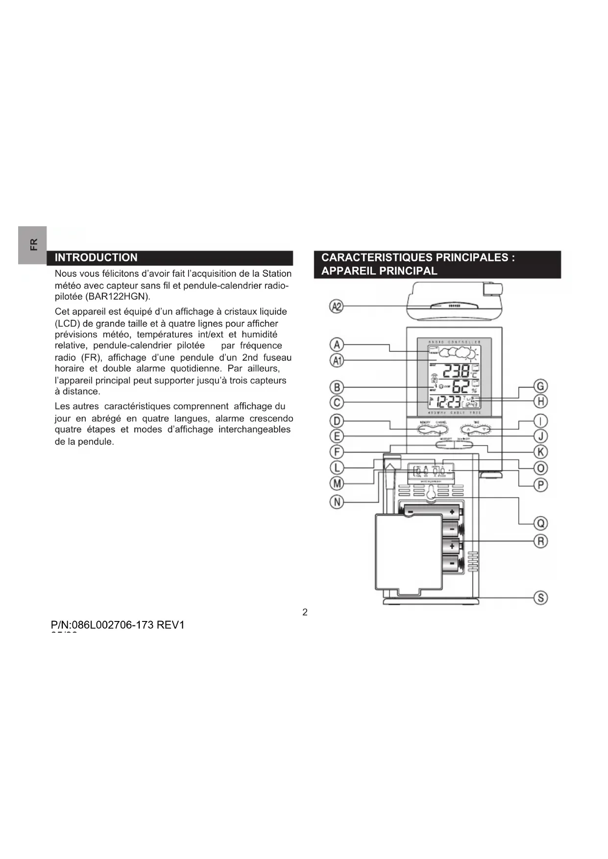 puis effectuer une remise à zéro après (avoir installé les piles). Ceci permettra une meilleure synchronisation entre l’émission et la réception des signaux. BAR122HGN_UM_FR.indd 4 3/18/08 3:11:53 PM