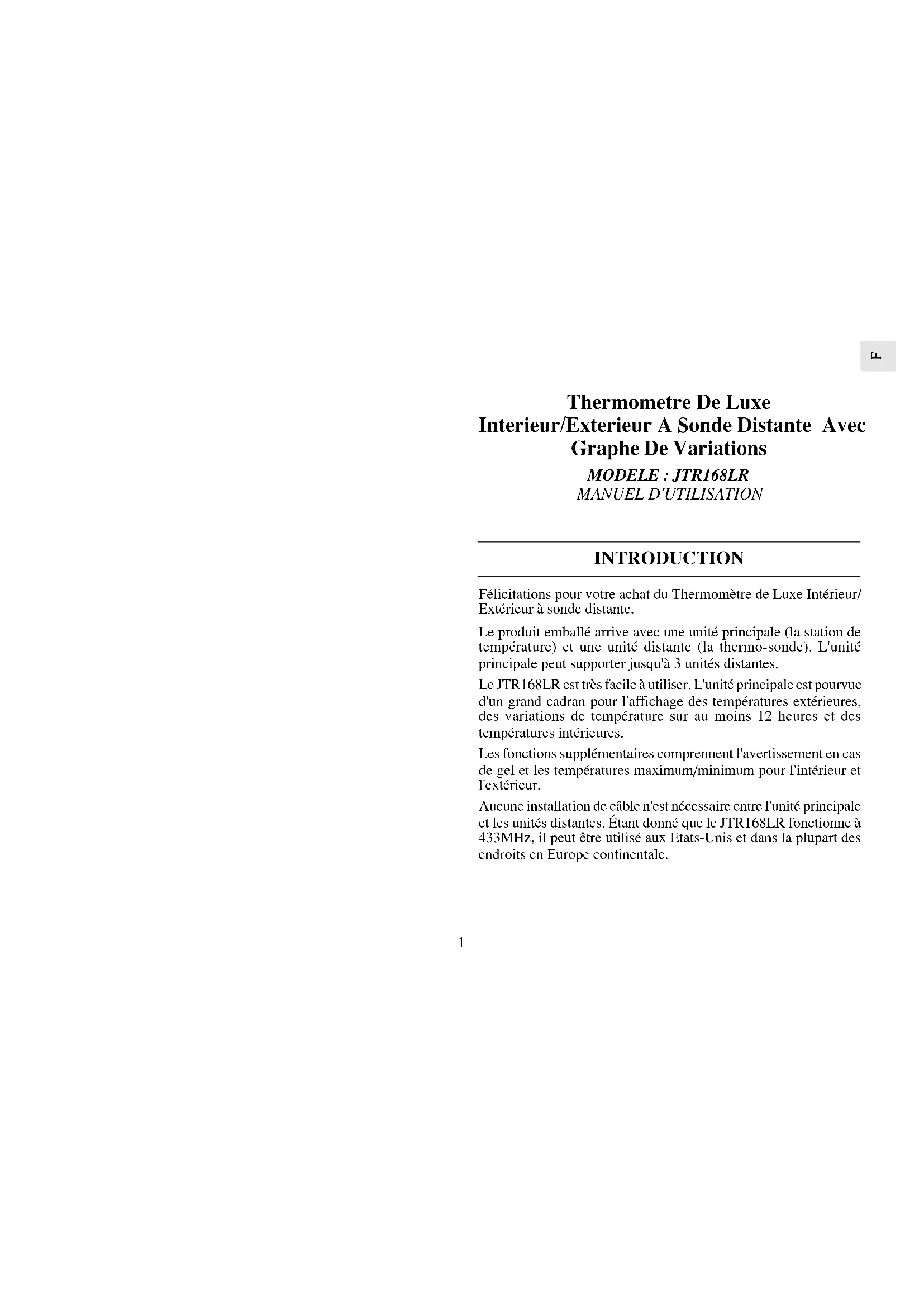 MANUEL D'UTILISATION INTRODUCTION Félicitations pour votre achat du Thermomètre de Luxe Intérieur/ Extérieur à sonde distante. Le produit emballé arrive avec une unité principale (la station de température) et une unité distante (la thermo-sonde). L'unité principale peut supporter jusqu'à 3 unités distantes. Le JTR168LR est très facile à utiliser. L'unité principale est pourvue d'un grand cadran pour l'affichage des températures extérieures, des variations de température sur au moins 12 heures et des températures intérieures. Les fonctions supplémentaires comprennent l'avertissement en cas de gel et les températures maximum/minimum pour l'intérieur et l'extérieur. Aucune installation de câble n'est nécessaire entre l'unité principale et les unités distantes. Étant donné que le JTR168LR fonctionne à 433MHz, il peut être utilisé aux Etats-Unis et dans la plupart des endroits en Europe continentale.F