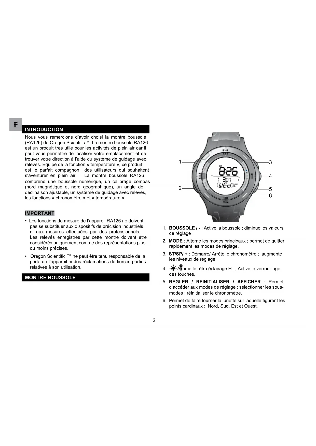 INTRODUCTION Nous vous remercions d’avoir choisi la montre boussole (RA126) de Oregon Scientific™. La montre boussole RA126 est un produit très utile pour les activités de plein air car il peut vous permettre de localiser votre emplacement et de trouver votre direction à l’aide du système de guidage avec relevés. Equipé de la fonction « température », ce produit est le parfait compagnon des utilisateurs qui souhaitent s’aventurer en plein air. La montre boussole RA126 comprend une boussole numérique, un calibrage compas (nord magnétique et nord géographique), un angle de déclinaison ajustable, un système de guidage avec relevés, les fonctions « chronomètre » et « température ». IMPORTANT