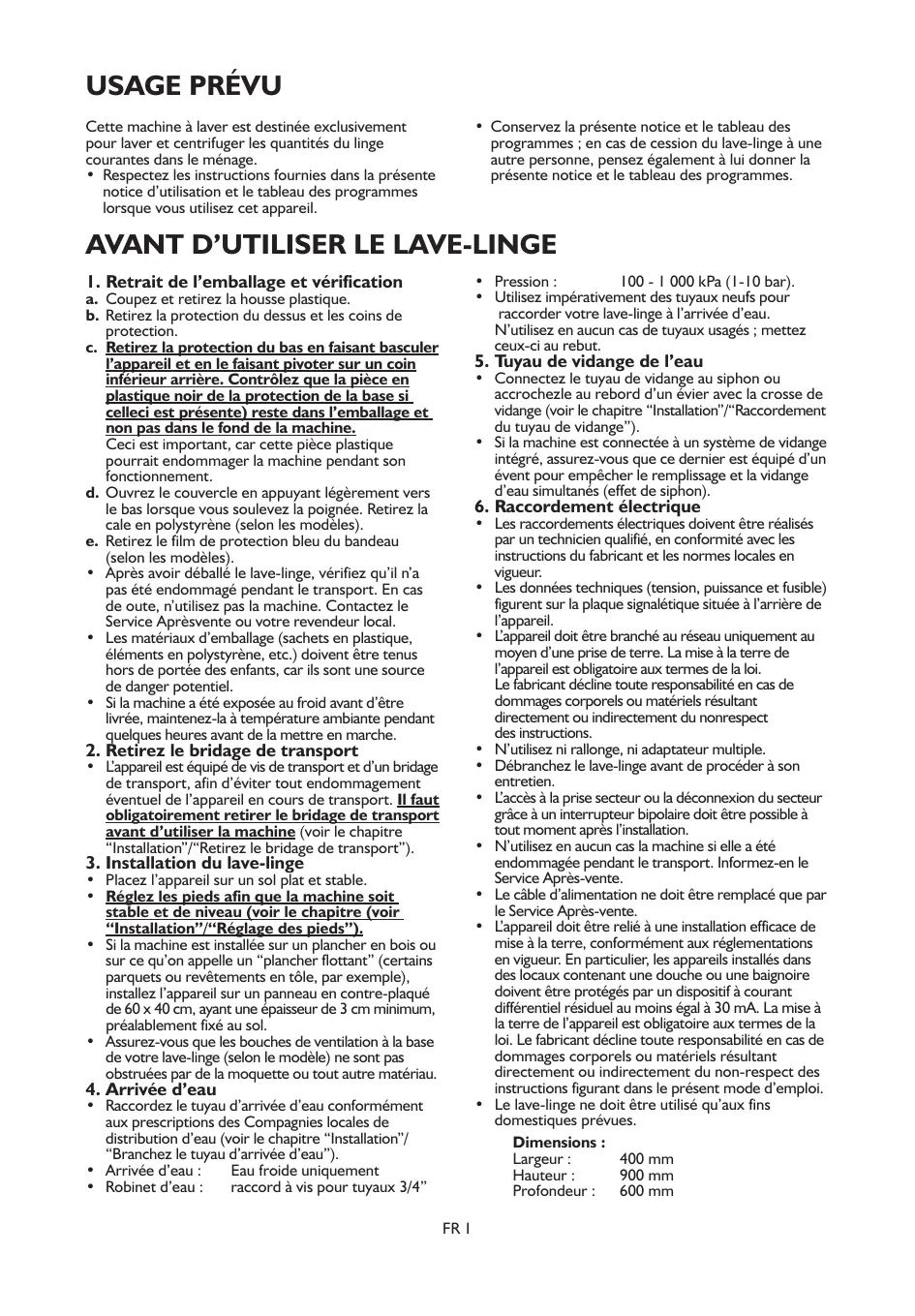 - Conservez la présente notice et le tableau des programmes ; en cas de cession du lave-linge à une autre personne, pensez également à lui donner la présente notice et le tableau des programmes.