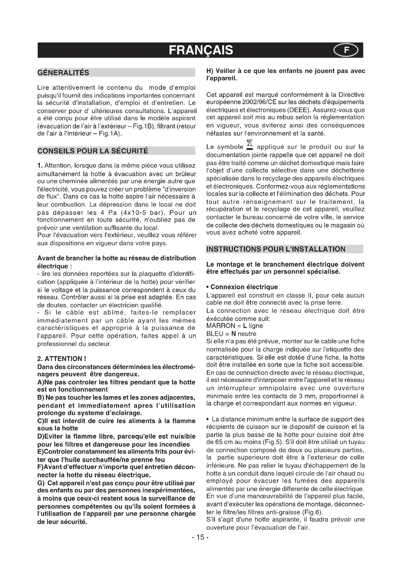 Dans des circonstances déterminées les électromé- nagers peuvent être dangereux. A)Ne pas controler les filtres pendant que la hotte est en fonctionnement B) Ne pas toucher les lames et les zones adjacentes, pendant et immediatement apres l’utilisation prolonge du systeme d’eclairage. C)Il est interdit de cuire les aliments à la flamme sous la hotte D)Eviter la flamme libre, parcequ'elle est nuisible pour les filtres et dangereuse pour les incendies E)Controler constamment les aliments frits pour évi- ter que l'huile surchauffée/ne prenne feu F)Avant d'effectuer n'importe quel entretien décon- necter la hotte du réseau électrique. G) Cet appareil n'est pas conçu pour être utilisé par des enfants ou par des personnes inexpérimentées, à moins que ceux-ci restent sous la surveillance de personnes compétentes ou qu'ils soient formées à l'utilisation de l'appareil par une personne chargée de leur sécurité. H) Veiller à ce que les enfants ne jouent pas avec l'appareil. Cet appareil est marqué conformément à la Directive européenne 2002/96/CE sur les déchets d'équipements électriques et électroniques (DEEE). Assurez-vous que cet appareil soit mis au rebus selon la réglementation en vigueur, vous éviterez ainsi des conséquences néfastes sur l'environnement et la santé. Le symbole appliqué sur le produit ou sur la documentation jointe rappelle que cet appareil ne doit pas être traité comme un déchet domestique mais faire l'objet d'une collecte sélective dans une déchetterie spécialisée dans le recyclage des appareils électriques et électroniques. Conformez-vous aux réglementations locales sur la collecte et l'élimination des déchets. Pour tout autre renseignement sur le traitement, la récupération et le recyclage de cet appareil, veuillez contacter le bureau concerné de votre ville, le service de collecte des déchets domestiques ou le magasin où vous avez acheté votre appareil.