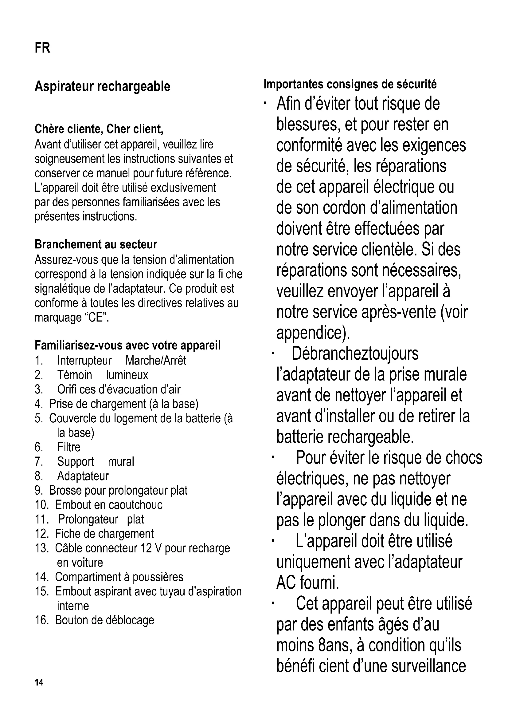 Importantes consignes de sécurité ∙ Afi n d’éviter tout risque de blessures, et pour rester en conformité avec les exigences de sécurité, les réparations de cet appareil électrique ou de son cordon d’alimentation doivent être effectuées par notre service clientèle. Si des réparations sont nécessaires, veuillez envoyer l’appareil à notre service après-vente (voir appendice). ∙ Débranchez toujours l’adaptateur de la prise murale avant de nettoyer l’appareil et avant d’installer ou de retirer la batterie rechargeable. ∙ Pour éviter le risque de chocs électriques, ne pas nettoyer l’appareil avec du liquide et ne pas le plonger dans du liquide. ∙ L’appareil doit être utilisé uniquement avec l’adaptateur AC fourni. ∙ Cet appareil peut être utilisé par des enfants âgés d’au moins 8ans, à condition qu’ils bénéfi cient d’une surveillance FR15 ou qu’ils aient reçu des instructions quant à l’utilisation de l’appareil en toute sécurité et qu’ils comprennent bien les dangers encourus. ∙ Le nettoyage et l’entretien par l’utilisateur ne doivent pas être effectués par des enfants, à moins qu’ils ne soient âgés de plus de 8ans et qu’ils soient sous la surveillance d’un adulte. ∙ Conserver l’appareil et son câble hors de portée des enfants âgés de moins de 8 ans. ∙ Cet appareil peut être utilisé par des personnes dont les capacités physiques, sensorielles ou mentale sont réduites ou dont l’expérience ou les connaissances ne sont pas suffi santes, à condition qu’ils bénéfi cient d’une surveillance ou qu’ils aient reçu des instructions quant à l’utilisation de l’appareil en toute sécurité et en comprennent bien les dangers potentiels. ∙ Les enfants ne doivent pas utiliser l’appareil comme un jouet. ∙ Attention : Tenez les enfants à l’écart des emballages, qui représentent un risque potentiel, par exemple, de suffocation. ∙ N’utilisez pas cet aspirateur sans fi ltre. ∙ Avant toute utilisation, vérifi ez soigneusement que l’appareil, son cordon d’alimentation et ses accessoires ne présentent aucun signe de détérioration qui pourrait avoir un effet néfaste sur la sécurité de fonctionnement de l’appareil. Au cas où l’appareil, par exemple, serait tombé sur une surface dure, ou si une force excessive aurait été employée pour tirer sur le cordon d’alimentation, il ne doit plus être utilisé. ∙ Le cordon d’alimentation de l’adaptateur ne doit pas être tordu et doit être posé au sol de façon à prévenir les risques de trébuchement. ∙ N’utilisez jamais l’appareil pour aspirer des matériaux chauds, acides ou infl ammables. Ne pas tenter d’aspirer des particules fi nes de poussière telles que la farine ou la poudre de toner. ∙ Ne permettez jamais que l’appareil ou le cordon d’alimentation touche une surface chaude ou entre en contact avec une source de chaleur. ∙ Ne tentez, en aucune circonstance, de démonter la batterie ; ne pas l’exposer à des températures élevées (comme par ex. les rayons directs du soleil) ; ne pas la jeter au feu.16 ∙ Ne pas court-circuiter les bornes de la batterie, comme par exemple toucher les deux bornes en même temps, surtout en employant des objets conducteurs d’électricité. La batterie doit être rangée de façon à prévenir le court-circuitage accidentel par un objet métallique quelconque ou d’autres batteries. ∙ Une batterie endommagée ne doit plus être utilisée. Retirez délicatement la batterie de l’appareil et éliminez-la en conformité avec les règlements locaux. Evitez tout contact avec des fuites de liquides. ∙ Aucune responsabilité n’est acceptée en cas de dégâts dus à une mauvaise utilisation ou si on ne se conforme pas à ces consignes. ∙ Cet appareil est destiné à être utilisé dans des applications domestiques et analogues telles que : - des coins cuisines réservés au personnel dans des magasins, bureaux et autres environnements professionnels ; - des fermes ; - l’utilisation par les clients des hôtels, motels et autres environnements à caractère résidentiel ; - des environnements de type chambres d’hôtes. Montage Le support mural est destiné au rangement de l’appareil et lui sert également de chargeur. Branchez d’abord la fi che de chargement dans la prise murale, vers le haut. Montez le support mural verticalement, à proximité d’une prise de courant, en vous servant des vis livrées avec l’appareil. Le prolongateur plat avec la brosse et l’embout en caoutchouc peuvent être rangés sur les côtés gauche et droit de l’appareil. Raccordement de la batterie rechargeable Le logement de la batterie est situé sous l’appareil. Ouvrez le compartiment en dévissant la vis du couvercle du compartiment à l’aide d’un tournevis adapté. Soulevez la batterie et pincez les deux connecteurs sur les fi ls de l’appareil et de la batterie ; assurez-vous que le loquet de verrouillage du connecteur de la batterie s’enclenche sur le loquet de fermeture du connecteur de l’appareil. Insérez la batterie dans le compartiment de l’appareil et installez les connecteurs le long de la batterie. Refermez le couvercle du logement de la batterie et revissez la vis. Chargement Avant d’utiliser l’aspirateur pour la première fois, il faut charger la batterie pendant environ 10 heures. ∙ Branchez l’adaptateur sur une prise murale. ∙ Placez l’interrupteur marche/arrêt sur la position arrêt. ∙ Insérez l’aspirateur dans le support mural. Le processus de charge démarre automatiquement et le témoin lumineux s’allume rouge. Une fois que le témoin lumineux s’éteint, l’appareil est prêt à être utilisé. ∙ Cet appareil peut rester en charge indéfi niment sans dégât ni danger, il est par conséquent en charge complète prêt à l’emploi à tout moment. ∙ L’adaptateur chauffe au cours du chargement. C