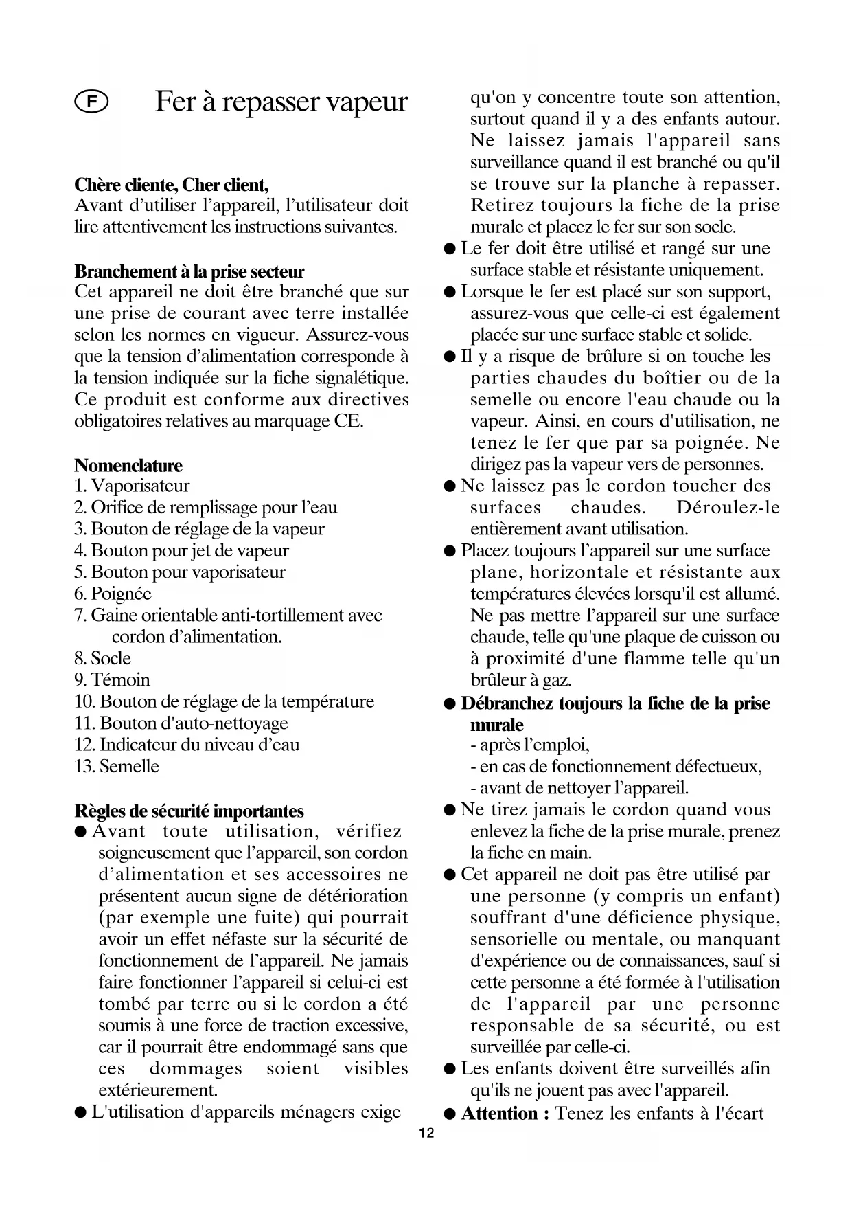 Règles de sécurité importantes ● Avant toute utilisation, vérifiez soigneusement que l’appareil, son cordon d’alimentation et ses accessoires ne présentent aucun signe de détérioration (par exemple une fuite) qui pourrait avoir un effet néfaste sur la sécurité de fonctionnement de l’appareil. Ne jamais faire fonctionner l’appareil si celui-ci est tombé par terre ou si le cordon a été soumis à une force de traction excessive, car il pourrait être endommagé sans que ces dommages soient visibles extérieurement. ● L'utilisation d'appareils ménagers exige qu'on y concentre toute son attention, surtout quand il y a des enfants autour. Ne laissez jamais l'appareil sans surveillance quand il est branché ou qu'il se trouve sur la planche à repasser. Retirez toujours la fiche de la prise murale et placez le fer sur son socle. ● Le fer doit être utilisé et rangé sur une surface stable et résistante uniquement. ● Lorsque le fer est placé sur son support, assurez-vous que celle-ci est également placée sur une surface stable et solide. ● Il y a risque de brûlure si on touche les parties chaudes du boîtier ou de la semelle ou encore l'eau chaude ou la vapeur. Ainsi, en cours d'utilisation, ne tenez le fer que par sa poignée. Ne dirigez pas la vapeur vers de personnes. ● Ne laissez pas le cordon toucher des surfaces chaudes. Déroulez-le entièrement avant utilisation. ● Placez toujours l’appareil sur une surface plane, horizontale et résistante aux températures élevées lorsqu'il est allumé. Ne pas mettre l’appareil sur une surface chaude, telle qu'une plaque de cuisson ou à proximité d'une flamme telle qu'un brûleur à gaz. ● Débranchez toujours la fiche de la prise murale - après l’emploi, - en cas de fonctionnement défectueux, - avant de nettoyer l’appareil. ● Ne tirez jamais le cordon quand vous enlevez la fiche de la prise murale, prenez la fiche en main. ● Cet appareil ne doit pas être utilisé par une personne (y compris un enfant) souffrant d'une déficience physique, sensorielle ou mentale, ou manquant d'expérience ou de connaissances, sauf si cette personne a été formée à l'utilisation de l'appareil par une personne responsable de sa sécurité, ou est surveillée par celle-ci. ● Les enfants doivent être surveillés afin qu'ils ne jouent pas avec l'appareil. ● Attention : Tenez les enfants à l'écart