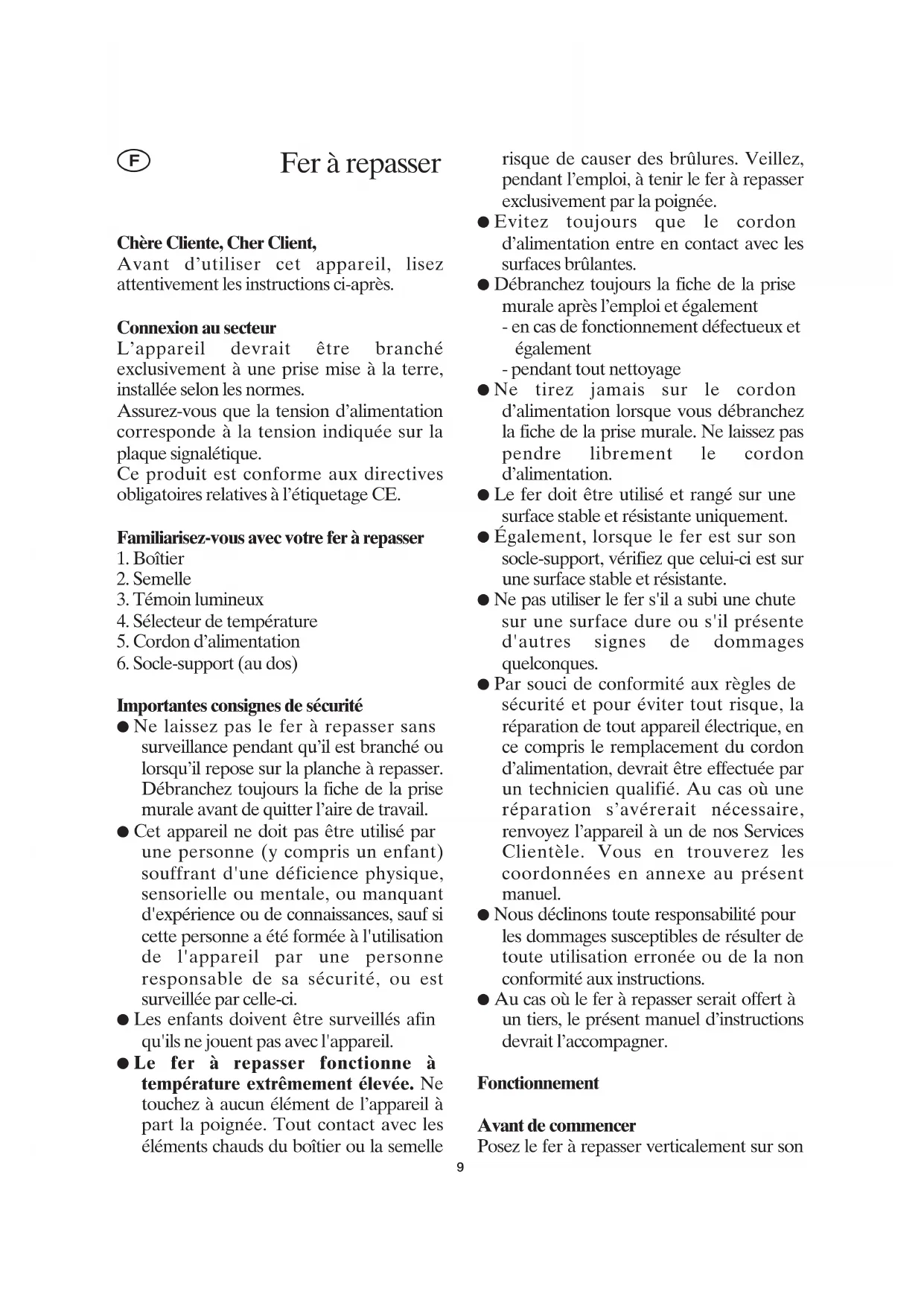 Importantes consignes de sécurité ● Ne laissez pas le fer à repasser sans surveillance pendant qu’il est branché ou lorsqu’il repose sur la planche à repasser. Débranchez toujours la fiche de la prise murale avant de quitter l’aire de travail. ● Cet appareil ne doit pas être utilisé par une personne (y compris un enfant) souffrant d'une déficience physique, sensorielle ou mentale, ou manquant d'expérience ou de connaissances, sauf si cette personne a été formée à l'utilisation de l'appareil par une personne responsable de sa sécurité, ou est surveillée par celle-ci. ● Les enfants doivent être surveillés afin qu'ils ne jouent pas avec l'appareil. ● Le fer à repasser fonctionne à température extrêmement élevée. Ne touchez à aucun élément de l’appareil à part la poignée. Tout contact avec les éléments chauds du boîtier ou la semelle risque de causer des brûlures. Veillez, pendant l’emploi, à tenir le fer à repasser exclusivement par la poignée. ● Evitez toujours que le cordon d’alimentation entre en contact avec les surfaces brûlantes. ● Débranchez toujours la fiche de la prise murale après l’emploi et également - en cas de fonctionnement défectueux et également - pendant tout nettoyage ● Ne tirez jamais sur le cordon d’alimentation lorsque vous débranchez la fiche de la prise murale. Ne laissez pas pendre librement le cordon d’alimentation. ● Le fer doit être utilisé et rangé sur une surface stable et résistante uniquement. ● Également, lorsque le fer est sur son socle-support, vérifiez que celui-ci est sur une surface stable et résistante. ● Ne pas utiliser le fer s'il a subi une chute sur une surface dure ou s'il présente d'autres signes de dommages quelconques. ● Par souci de conformité aux règles de sécurité et pour éviter tout risque, la réparation de tout appareil électrique, en ce compris le remplacement du cordon d’alimentation, devrait être effectuée par un technicien qualifié. Au cas où une réparation s’avérerait nécessaire, renvoyez l’appareil à un de nos Services Clientèle. Vous en trouverez les coordonnées en annexe au présent manuel. ● Nous déclinons toute responsabilité pour les dommages susceptibles de résulter de toute utilisation erronée ou de la non conformité aux instructions. ● Au cas où le fer à repasser serait offert à un tiers, le présent manuel d’instructions devrait l’accompagner. Fonctionnement Avant de commencer Posez le fer à repasser verticalement sur son