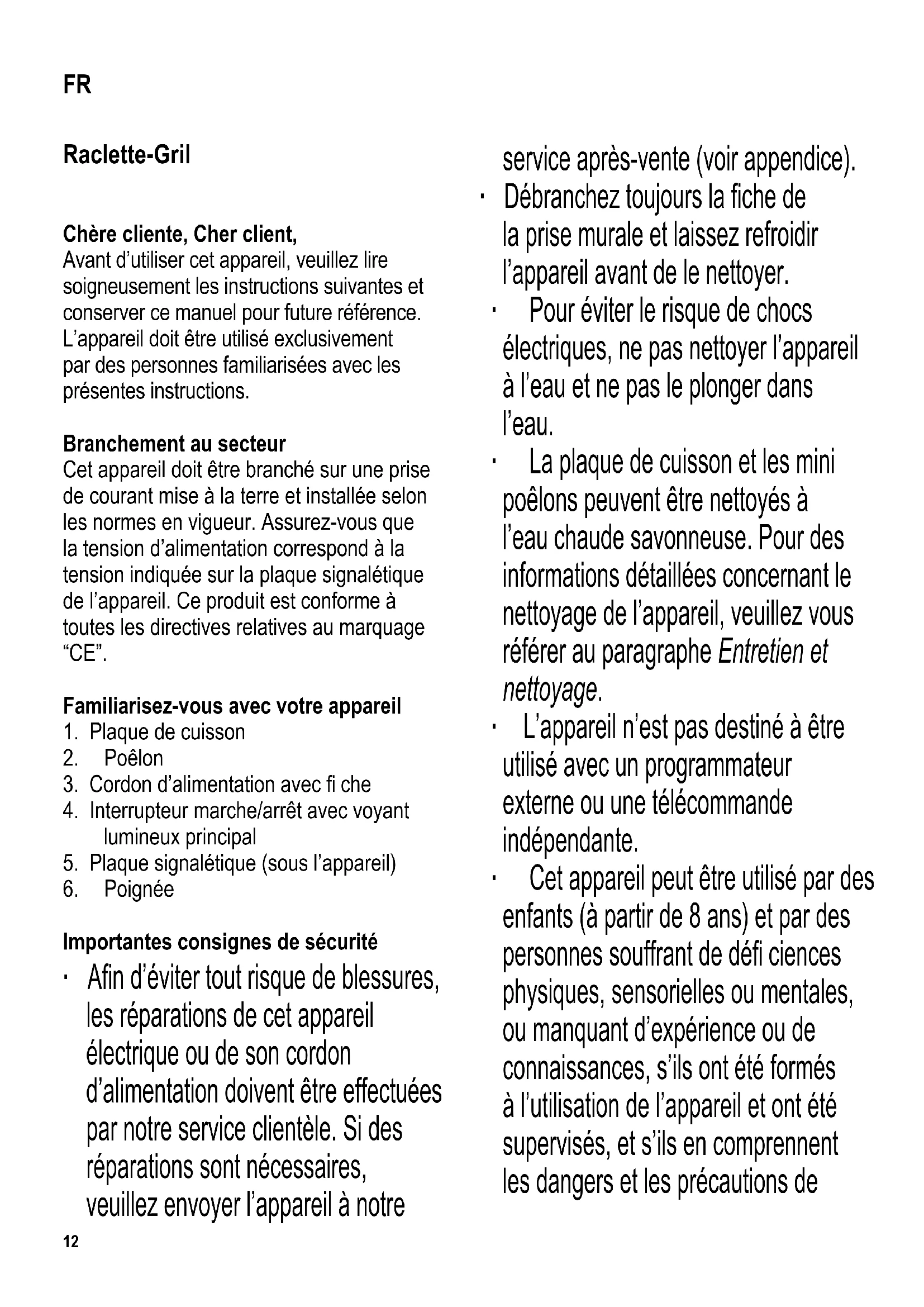 Importantes consignes de sécurité ∙ A fi n d’éviter tout risque de blessures, les réparations de cet appareil électrique ou de son cordon d’alimentation doivent être effectuées par notre service clientèle. Si des réparations sont nécessaires, veuillez envoyer l’appareil à notre service après-vente (voir appendice). ∙ Débranchez toujours la fi che de la prise murale et laissez refroidir l’appareil avant de le nettoyer. ∙ Pour éviter le risque de chocs électriques, ne pas nettoyer l’appareil à l’eau et ne pas le plonger dans l’eau. ∙ La plaque de cuisson et les mini poêlons peuvent être nettoyés à l’eau chaude savonneuse. Pour des informations détaillées concernant le nettoyage de l’appareil, veuillez vous référer au paragraphe Entretien et nettoyage. ∙ L’appareil n’est pas destiné à être utilisé avec un programmateur externe ou une télécommande indépendante. ∙ Cet appareil peut être utilisé par des enfants (à partir de 8 ans) et par des personnes souffrant de défi ciences physiques, sensorielles ou mentales, ou manquant d’expérience ou de connaissances, s’ils ont été formés à l’utilisation de l’appareil et ont été supervisés, et s’ils en comprennent les dangers et les précautions de FR13 sécurité à prendre. ∙ Les enfants ne sont pas autorisés à jouer avec l’appareil. ∙ Les enfants ne doivent pas être autorisés à nettoyer ou entretenir l’appareil à moins d’être supervisés et d’avoir plus de 8 ans. ∙ L’appareil et son cordon d’alimentation doivent être, à tout moment, tenus hors de portée des enfants de moins de 8 ans. ∙ Attention : Tenez les enfants à l’écart des emballages, qui représentent un risque potentiel, par exemple, de suffocation. ∙ Avant toute utilisation, vérifi ez soigneusement que l’appareil, son cordon d’alimentation et ses accessoires ne présentent aucun signe de détérioration qui pourrait avoir un effet néfaste sur la sécurité de fonctionnement de l’appareil. Ne jamais faire fonctionner l’appareil si celui-ci est tombé par terre ou si le cordon a été soumis à une force de traction excessive, car il pourrait être endommagé sans que ces dommages soient visibles extérieurement. ∙ Examinez régulièrement le cordon pour vous assurer de son parfait état. N’utilisez pas l’appareil si le cordon est endommagé. ∙ Le cordon doit toujours être tenu à l’écart des surfaces chaudes de l’appareil. ∙ Attention : risque de brûlure. Les parties extérieures de l’appareil, les surfaces de cuisson et les mini poêlons deviennent chauds pendant l’utilisation. ∙ Ne jamais faire fonctionner l’appareil sans surveillance. ∙ Placez l’appareil sur une surface de travail plane, horizontale et résistante à la chaleur et aux éclaboussures d’eau ou de graisse. ∙ Prenez soin de ne pas placer l’appareil contre un mur ou dans un angle, et de le tenir à l’écart de toute matière infl ammable. ∙ Avant utilisation, la plaque de cuisson doit être installée et verrouillée sur l’appareil, au-dessus de la résistance. ∙ Attention : n’utilisez pas l’appareil à l’extérieur. ∙ Débranchez toujours la fi che de la prise murale - après utilisation, - en cas de fonctionnement défectueux, - avant de nettoyer l’appareil. ∙ Ne pas débrancher l’appareil en tirant sur le cordon ; tirez toujours sur la fi che. ∙ L’appareil doit être utilisé uniquement avec les accessoires originaux. ∙ Laissez toujours suffi samment de temps à l’appareil de refroidir avant d’enlever la plaque de cuisson et avant de nettoyer ou de ranger l’appareil. ∙ Nous déclinons toute responsabilité pour les dommages éventuels subis par cet appareil, résultant d’une utilisation incorrecte ou du non-respect de ce mode d’emploi. ∙ Cet appareil est destiné à une utilisation domestique ou similaire, telle que dans des - bureaux et autres locaux commerciaux, - des zones agricoles, - par la clientèle dans les hôtels, motels14 et établissements similaires, - et des maisons d’hôtes. Avant la première mise en marche ∙ Retirez complètement tous les emballages. ∙ Avant de mettre l’appareil en route pour la première fois, nettoyez la plaque de cuisson et les mini poêlons avec un chiffon humide. ∙ Faites chauffer l’appareil et les mini poêlons pendant environ 15 minutes, sans aucun aliment, pour éliminer l’odeur caractéristique qui se dégage lorsqu’un gril est allumé pour la première fois (une légère fumée peut également se dégager). Assurez une ventilation suffi sante en ouvrant les fenêtres ou les porte-fenêtres. ∙ Laissez à nouveau refroidir le gril. ∙ Nettoyez-le tel indiqué au paragraphe Entretien et nettoyage. Plaque de cuisson Avant de mettre l’appareil en marche, placez la grille de cuisson sur l’appareil, au-dessus de la résistance et verrouillez-la. Pour verrouiller, appuyez sur la plaque de cuisson et faites-la avancer vers le symbole