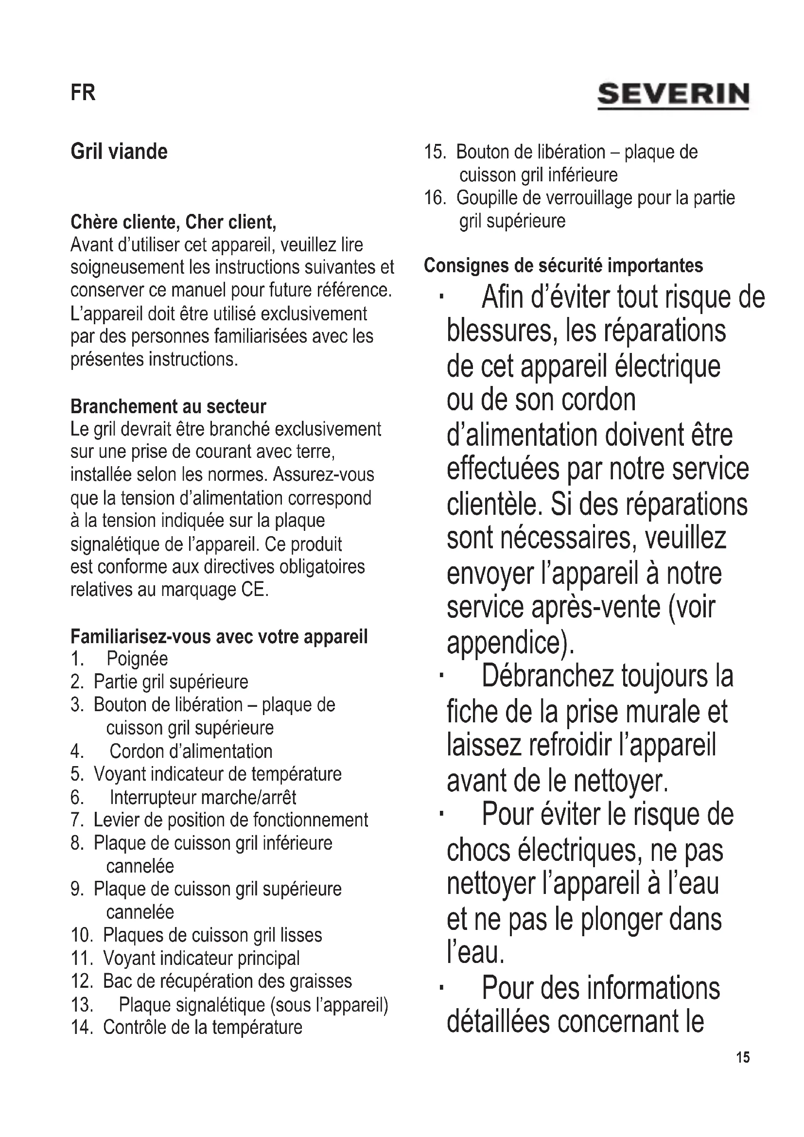 Gril viande Chère cliente, Cher client, Avantd’utilisercetappareil,veuillezlire soigneusement les instructions suivantes et conserver ce manuel pour future référence. L’appareildoitêtreutiliséexclusivement par des personnes familiarisées avec les présentes instructions. Branchement au secteur Legrildevraitêtrebranchéexclusivement sur une prise de courant avec terre, installée selon les normes. Assurez-vous quelatensiond’alimentationcorrespond à la tension indiquée sur la plaque signalétiquedel’appareil.Ceproduit est conforme aux directives obligatoires relatives au marquage CE. Familiarisez-vous avec votre appareil