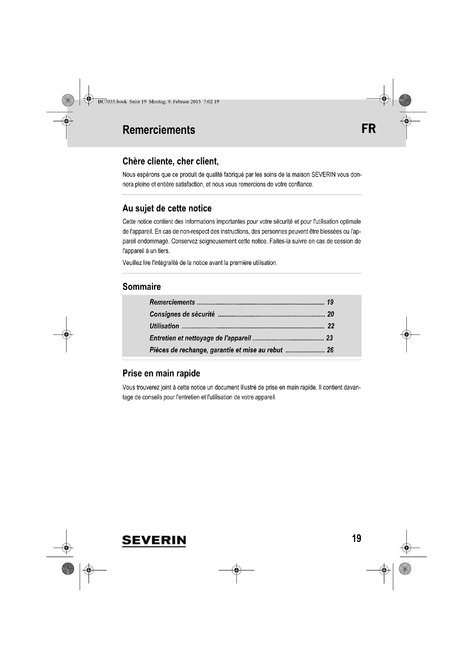 Retrouvez gratuitement la notice de l'appareil BC 7035 SEVERIN au format PDF.