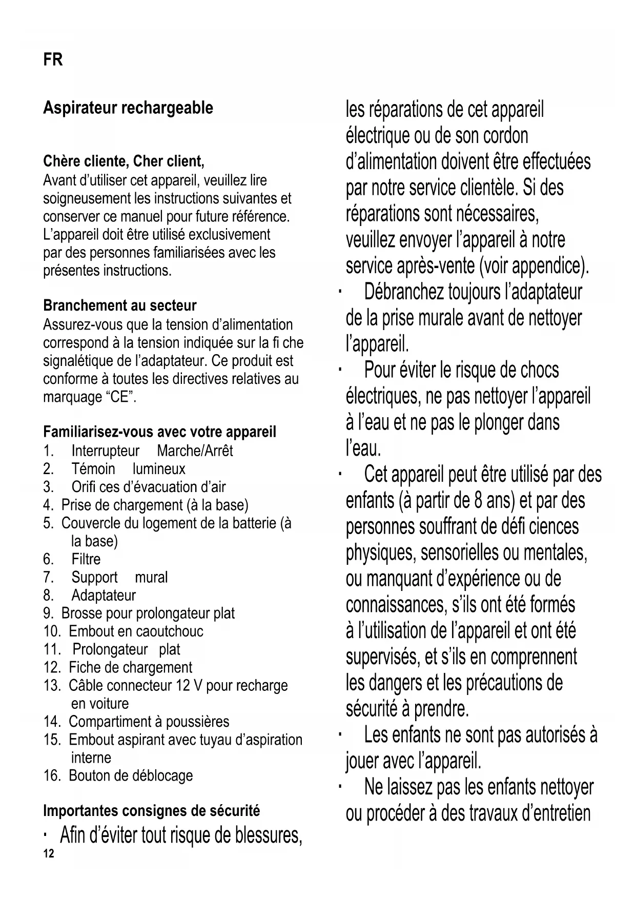 Importantes consignes de sécurité ∙ A fi n d’éviter tout risque de blessures, les réparations de cet appareil électrique ou de son cordon d’alimentation doivent être effectuées par notre service clientèle. Si des réparations sont nécessaires, veuillez envoyer l’appareil à notre service après-vente (voir appendice). ∙ Débranchez toujours l’adaptateur de la prise murale avant de nettoyer l’appareil. ∙ Pour éviter le risque de chocs électriques, ne pas nettoyer l’appareil à l’eau et ne pas le plonger dans l’eau. ∙ Cet appareil peut être utilisé par des enfants (à partir de 8 ans) et par des personnes souffrant de défi ciences physiques, sensorielles ou mentales, ou manquant d’expérience ou de connaissances, s’ils ont été formés à l’utilisation de l’appareil et ont été supervisés, et s’ils en comprennent les dangers et les précautions de sécurité à prendre. ∙ Les enfants ne sont pas autorisés à jouer avec l’appareil. ∙ Ne laissez pas les enfants nettoyer ou procéder à des travaux d’entretien FR13 ou de maintenance sur l’appareil à moins d’être supervisés. ∙ L’appareil et son cordon d’alimentation doivent être, à tout moment, tenus hors de portée des enfants de moins de 8 ans. ∙ Attention : Tenez les enfants à l’écart des emballages, qui représentent un risque potentiel, par exemple, de suffocation. ∙ N’utilisez pas cet aspirateur sans fi ltre ∙ Avant toute utilisation, vérifi ez soigneusement que l’appareil, son cordon d’alimentation et ses accessoires ne présentent aucun signe de détérioration qui pourrait avoir un effet néfaste sur la sécurité de fonctionnement de l’appareil. Au cas où l’appareil, par exemple, serait tombé sur une surface dure, ou si une force excessive aurait été employée pour tirer sur le cordon d’alimentation, il ne doit plus être utilisé. ∙ N’utilisez jamais l’appareil pour aspirer des matériaux chauds, acides ou infl ammables. ∙ Les enfants doivent être surveillés afi n qu’ils ne jouent pas avec l’appareil. ∙ Cet appareil est destiné à une utilisation domestique ou similaire, telle que - dans des bureaux et autres locaux commerciaux, - dans des organisations agricoles, - par la clientèle dans les hôtels, motels et établissements similaires, - et dans des maisons d’hôtes. Montage Le support mural est destiné au rangement de l’appareil et lui sert également de chargeur. Branchez d’abord la fi che de chargement dans la prise murale, vers le haut. Montez le support mural verticalement, à proximité d’une prise de courant, en vous servant des vis livrées avec l’appareil. Le prolongateur plat avec la brosse et l’embout en caoutchouc peuvent être rangés sur les côtés gauche et droit de l’appareil. Chargement Avant d’utiliser l’aspirateur pour la première fois, il faut charger la batterie pendant environ 10 heures. ∙ Branchez l’adaptateur sur une prise murale. ∙ Placez l’interrupteur marche/arrêt sur la position arrêt. ∙ Insérez l’aspirateur dans le support mural. Le processus de charge démarre automatiquement et le témoin lumineux s’allume rouge. Une fois que le témoin lumineux s’éteint, l’appareil est prêt à être utilisé. ∙ Cet appareil peut rester en charge indéfi niment sans dégât ni danger, il est par conséquent en charge complète prêt à l’emploi à tout moment. ∙ L’adaptateur chauffe au cours du chargement. C’est tout à fait normal et sans danger et n’indique pas une défaillance quelconque. ∙ Si l’aspirateur n’est pas utilisé pendant une longue période, la capacité de la batterie pourrait être quelque peu réduite. La pleine capacité reviendra néanmoins au bout de quelques cycles de chargement/déchargement. Fonctionnement 12 V ∙ Grâce au câble connecteur 12 V, le14 pack batterie peut être rechargé en le branchant sur l’allume-cigare de la voiture. ∙ Insérez la petite fi che du câble connecteur dans la douille de 12V de l’aspirateur, et la grande fi che dans la prise de l’allume-cigare de la voiture. ∙ L’alimentation électrique est à présent fournie automatiquement par la voiture et le témoin lumineux s’allume rouge. Aspiration des liquides Avant d’aspirer un liquide, vérifi ez que l’embout en caoutchouc est inséré complètement dans la bouche d’aspiration. Prolongateur plat Le prolongateur plat peut être inséré dans l’orifi ce d’aspiration pour nettoyer les fentes, coins et autres endroits d’accès diffi cile. Brosse pour prolongateur plat La brosse se fi xe sur le prolongateur plat et convient au nettoyage des surfaces irrégulières telles que les claviers etc. Utilisation ∙ Oter l’aspirateur de son support mural. ∙ Si nécessaire, adaptez au choix un des accessoires fournis à l’ouverture d’aspiration. ∙ Mettez l’appareil en marche au moyen de l’interrupteur Marche/Arrêt. Le témoin lumineux s’allume vert. ∙ Videz régulièrement le bac à poussière, et toujours avant que la poussière ou le liquide ramassé n’arrive au niveau du tube d’aspiration intérieur (voir repère max.). ∙ Si la batterie perd de sa puissance pendant l’utilisation, le témoin lumineux vert se met à clignoter et l’appareil s’éteint ; ceci afi n d’éviter une décharge complète du pack batterie. Dans ce cas, le pack batterie doit être rechargé. Assurez-vous toujours que l’appareil est arrêté avant de le replacer sur son support mural. Nettoyage Généralités ∙ Avant de nettoyer l’aspirateur, enlevez-le du support mural. ∙ Pour éviter tout risque de choc électrique, ne nettoyez pas l’appareil ni l’adaptateur à l’eau et ne le plongez pas dans l’eau ou d’autres liquides. ∙ Au besoin, on peut essuyer le boîtier avec un chiffon humide. Essuyez ensuite pour sécher. Pour vider le compartiment à poussières Une puissance d’aspiration réduite même a