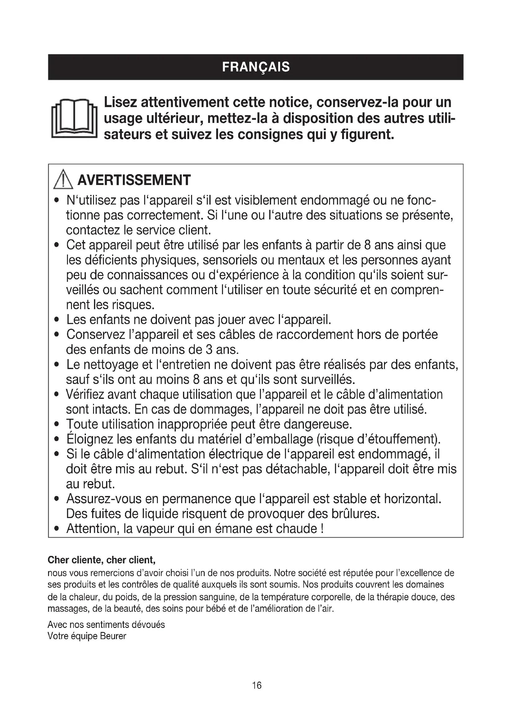 - Attention, la vapeur qui en émane est chaude! Cher cliente, cher client, nous vous remercions d’avoir choisi l’un de nos produits. Notre société est réputée pour l’excellence de ses produits et les contrôles de qualité auxquels ils sont soumis. Nos produits couvrent les domaines de la chaleur, du poids, de la pression sanguine, de la température corporelle, de la thérapie douce, des massages, de la beauté, des soins pour bébé et de l’amélioration de l’air. Avec nos sentiments dévoués Votre équipe Beurer FRANÇAIS17