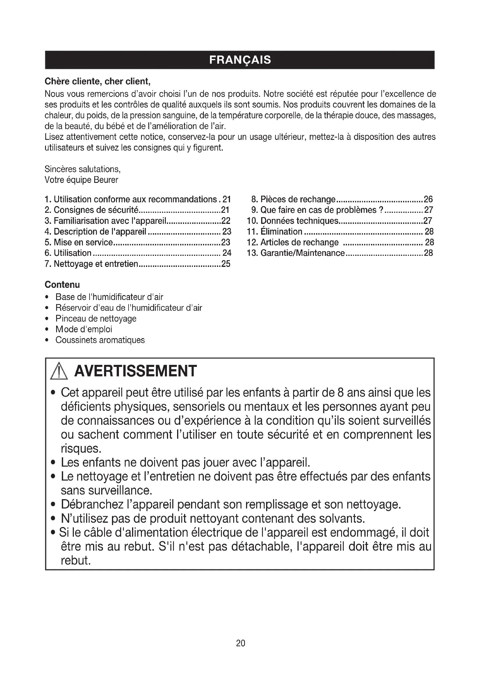 the unit is accepted as a warranty claim. Subject to errors and changes20 Chère cliente, cher client, Nous vous remercions d’avoir choisi l’un de nos produits. Notre société est réputée pour l’excellence de ses produits et les contrôles de qualité auxquels ils sont soumis. Nos produits couvrent les domaines de la chaleur, du poids, de la pression sanguine, de la température corporelle, de la thérapie douce, des massages, de la beauté, du bébé et de l’amélioration de l’air. Lisez attentivement cette notice, conservez-la pour un usage ultérieur, mettez-la à disposition des autres utilisateurs et suivez les consignes qui y figurent. Sincères salutations, Votre équipe Beurer Contenu