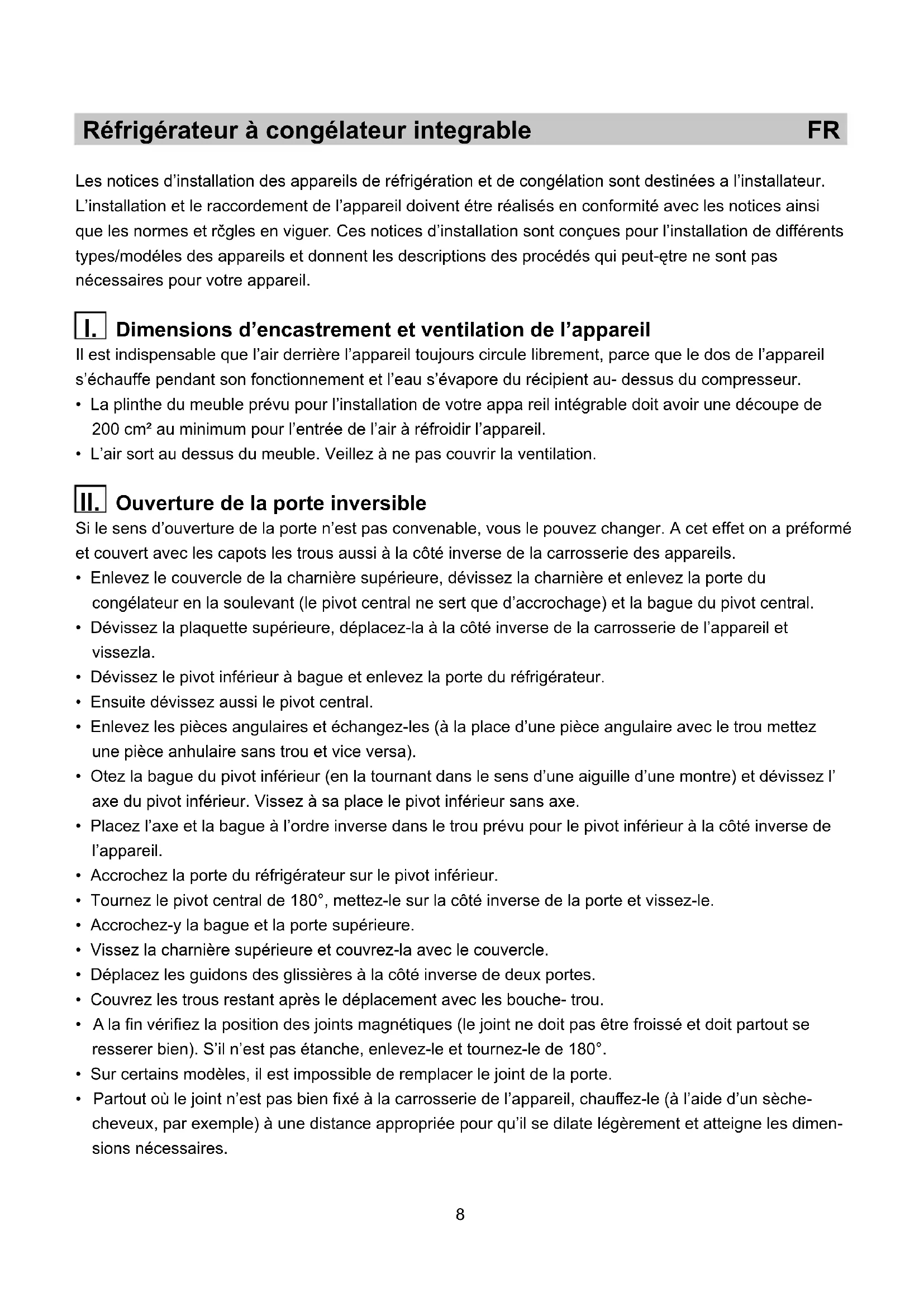 - L’air sort au dessus du meuble. Veillez à ne pas couvrir la ventilation. Ouverture de la porte inversible Si le sens d’ouverture de la porte n’est pas convenable, vous le pouvez changer. A cet effet on a préformé et couvert avec les capots les trous aussi à la côté inverse de la carrosserie des appareils.