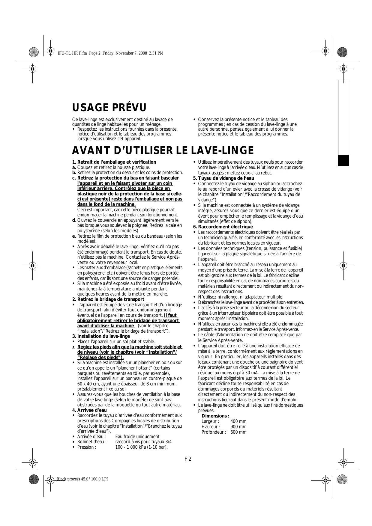 - Après quoi, sélectionnez à nouveau le programme souhaité et démarrez-le en veillant à utiliser moins de détergent. Si l’une des anomalies susmentionnées persiste, débranchez l’appareil, fermez le robinet d’arrivée d’eau et contactez le Service Après-vente (voir le chapitre suivant). Si votre lave-linge n’est pas équipé d’un affichage du temps résiduel, essayez d’identifier laquelle des situations décrites ci-dessus pourrait être à l’origine de la panne et suivez les instructions qui s’y rapportent. F 14 Black process 45.0° 100.0 LPI IFU-TL HR F.fm Page 15 Friday, November 7, 2008 2:31 PM