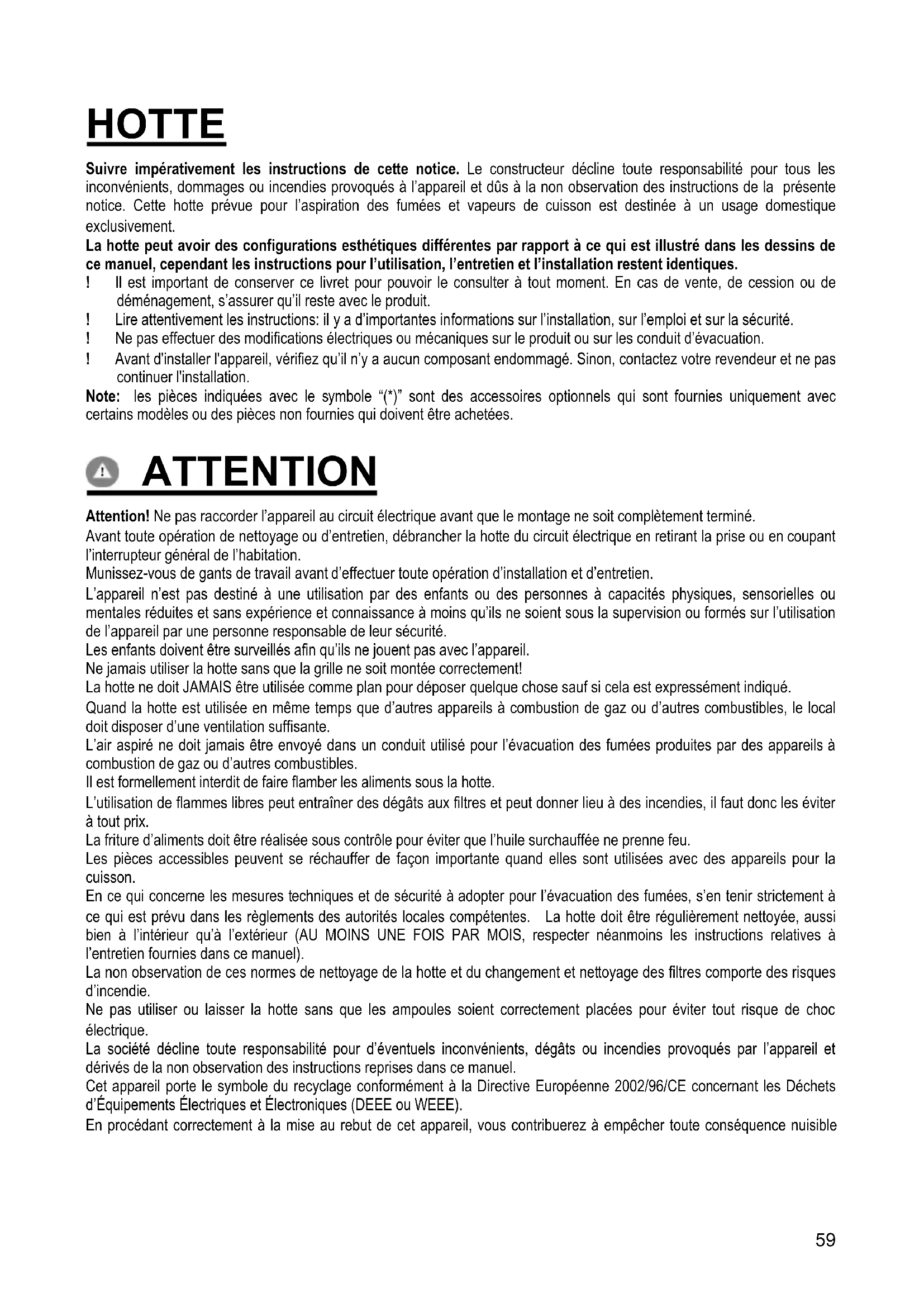 - CEM : EN 55014-1 ; CISPR 14-1 ; EN 55014-2 ; CISPR 14-2 ; EN/CEI 61000-3-2 ; EN/CEI 61000-3-3. Suggestions pour une utilisation correcte afin de réduire l’impact environnemental : Allumer la hotte à la vitesse minimum pendant la cuisson et la laisser fonctionner pendant quelques minutes après la fin de la cuisson. Augmenter la vitesse uniquement en présence d’une grande quantité de fumée ou de vapeur et n’utiliser la/les vitesse(s) accélérées que dans les cas extrêmes. Remplacer le(s) filtre(s) au charbon lorsque cela est nécessaire afin de maintenir une réduction efficace des odeurs. Nettoyer le(s) filtres à graisse lorsque cela est nécessaire afin de maintenir un filtrage efficace des graisses. Utiliser un système de tuyauterie du diamètre maximum indiqué dans ce manuel afin d’optimiser le rendement et de minimiser le bruit. ATTENTION! Ne pas installer les vis et les éléments de fixation conformément à ces instructions peut entraîner des risques électriques. UTILISATION La hotte est réalisée de façon qu’elle puisse être utilisée en version aspirante à évacuation extérieure, ou filtrante à recyclage intérieur. Version évacuation extérieure Les vapeurs sont évacuées vers l'extérieur à travers un conduit d'évacuation fixé à la bride de raccord qui se trouve au- dessus de la hotte. Attention! Le tuyau d’évacuation n’est pas fourni et doit être acheté à part. Le diamètre du tuyau d'évacuation doit être égal à celui de la bride de raccord. Sur la partie horizontale, le tuyau doit avoir une légère inclinaison vers le haut (10° env.) de façon à convoyer plus facilement l’air vers l’extérieur. Si la hotte est équipée d'un filtre à charbon, ce dernier doit être enlevé. Relier la hotte aux tubes et trous d’évacuation de la paroi d’un diamètre équivalent à la sortie de l’air (collier de raccord). L’utilisation de tubes et des trous d'évacuation à paroi avec un diamètre inférieur entraînera une diminution des performances d’aspiration et une nette augmentation du bruit. Nous déclinons toute responsabilité à cet égard. ! Utiliser un tuyau de la longueur strictement nécessaire. ! Les coudes du tuyau doivent être en nombre minime (angle maxi du coude: 90°). ! Éviter les variations excessives de section du tuyau. ! Utiliser un tuyau le plus lisse possible sur sa partie interne. ! Le matériau du tuyau doit être aux normes. Version recyclage Il convient d’utiliser un filtre à charbon actif, disponible auprès de vôtre revendeur habituel. L’air aspiré sera dégraissé et désodorisé avant d’être refoulé dans la pièce à travers la grille supérieure.61 INSTALLATION La distance minimum entre la superficie de support des récipients sur le dispositif de cuisson et la partie la plus basse de la hotte de cuisine ne doit pas être inférieure à 45cm dans le cas de cuisinières électriques et de 50cm dans le cas de cuisinières à gaz ou mixtes. Si les instructions d’installation du dispositif de cuisson au gaz spécifient une plus grande distance, il faut en tenir compte. Branchement électrique La tension électrique doit correspondre à la tension reportée sur la plaque signalétique située à l’intérieur de la hotte. Si une prise est présente, branchez la hotte dans une prise murale conforme aux normes en vigueur et placée dans une zone accessible également après l’installation. Si aucune prise n’est présente (raccordement direct au circuit électrique), ou si la prise ne se trouve pas dans une zone accessible également après l’installation, appliquez un disjoncteur normalisé pour assurer de débrancher complètement la hotte du circuit électrique en conditions de catégorie surtension III, conformément aux règlementations de montage. Attention! Avant de rebrancher le circuit de la hotte à l’alimentation électrique et d’en vérifier le fonctionnement correct, contrôlez toujours que le câble d’alimentation soit monté correctement. La hotte est pourvue d'un câble d'alimentation spécial; en cas de détérioration du câble, en demander un neuf au service d'assistance technique. Montage Appareil excessivement lourd ; la manutention et l’installation de la hotte doivent être effectuées par deux personnes ou plus. Avant de commencer l’installation:
