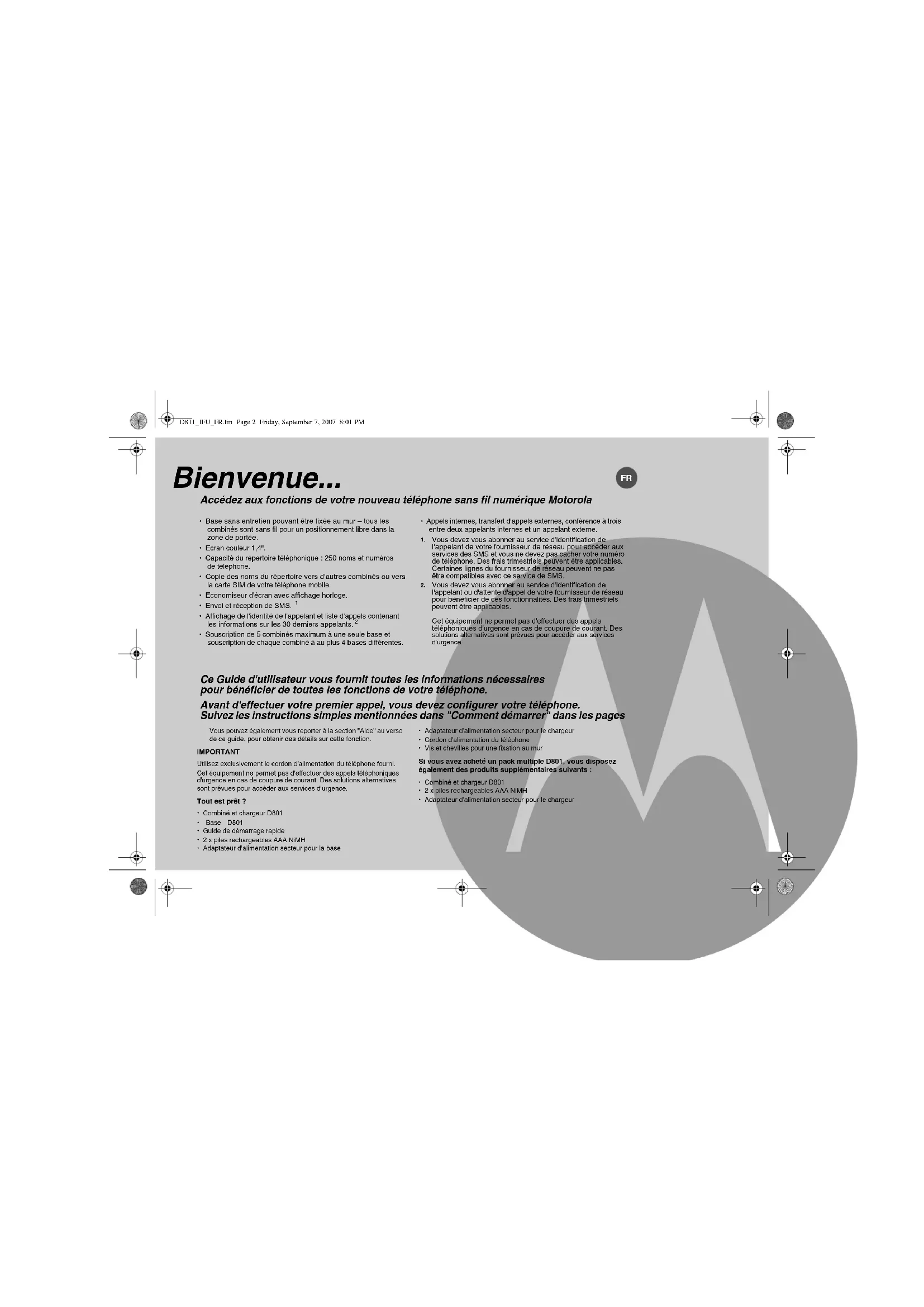 Vous devez vous abonner au service d'identification de l'appelant ou d'attente d'appel de votre fournisseur de réseau pour bénéficier de ces fonctionnalités. Des frais trimestriels peuvent être applicables. Cet équipement ne permet pas d'effectuer des appels téléphoniques d'urgence en cas de coupure de courant. Des solutions alternatives sont prévues pour accéder aux services d'urgence. Bienvenue... Accédez aux fonctions de votre nouveau téléphone sans fil numérique Motorola Ce Guide d'utilisateur vous fournit toutes les informations nécessaires pour bénéficier de toutes les fonctions de votre téléphone. Avant d'effectuer votre premier appel, vous devez configurer votre téléphone. Suivez les instructions simples mentionnées dans "Comment démarrer" dans les pages Vous pouvez également vous reporter à la section "Aide" au verso de ce guide, pour obtenir des détails sur cette fonction. IMPORTANT Utilisez exclusivement le cordon d'alimentation du téléphone fourni.Cet équipement ne permet pas d'effectuer des appels téléphoniques d'urgence en cas de coupure de courant. Des solutions alternatives sont prévues pour accéder aux services d'urgence. Tout est prêt ?