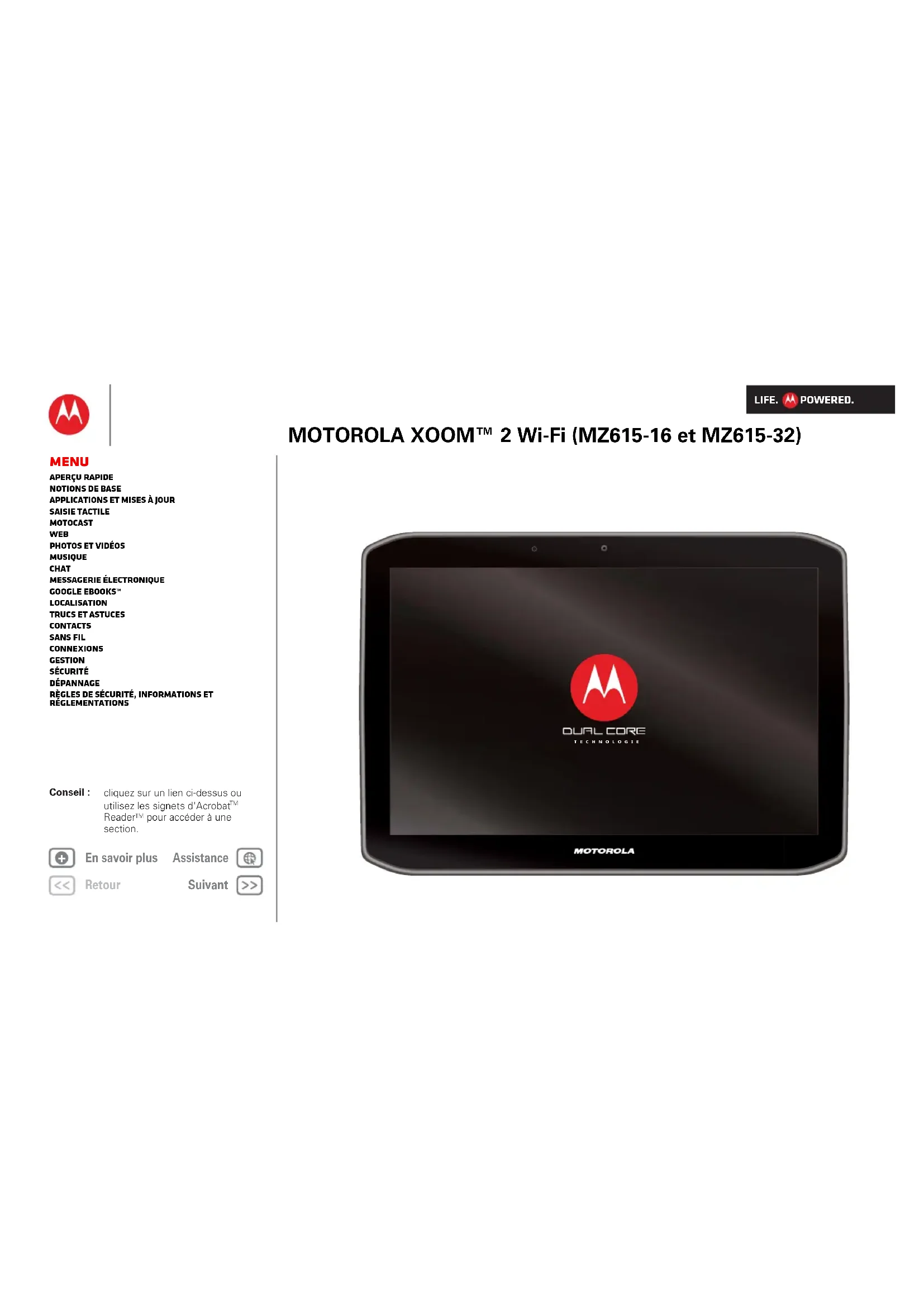 Warr ant yAvis important :POUR LES CONSOMMATEURS BENEFICIANT DE MESURES LÉGISLATIVES OU RÉGLEMENTAIRES DE PROTECTION DANS LE PAYS D'ACHAT OU, SI ELLES DIFFÈRENT, DANS LEUR PAYS DE RÉSIDENCE, LES AVANTAGES OCTROYÉS PAR LA PRÉSENTE GARANTIE LIMITÉE SONT ACCORDÉS EN SUS DE L'ENSEMBLE DES DROITS ET RECOURS CONFÉRÉS PAR LESDITES LOIS ET RÉGLEMENTATIONS DE PROTECTION DES CONSOMMATEURS.Qui est couvert ?La présente garantie s'applique uniquement au premier acheteur de la tablette PC Motorola (le " Produit ") qui a la qualité de consommateur, et ne peut être transmise ou cédée à un tiers, de quelque manière que ce soit (le tout est ci-après référé comme « Garantie Limitée »).Étendue de la Garantie Limitée Les obligations de Motorola concernant la présente garantie sont limitées aux termes et conditions mentionnés dans les présentes et sont uniquement applicables dans le pays où le Produit a été acheté. Sous réserve des exclusions explicitées ci-après (et notamment s'agissant des Consommables), Motorola, tel que défini ci-dessous, garantit que le Produit est exempt de tout défaut de matières et vice de fabrication, sous condition d'une utilisation normale, pendant une période d'UN (1) AN à compter de la date d'achat en point de vente au détail par le premier acheteur du Produit qui a la qualité de consommateur (« Période de garantie »).Les Produits réparés ou remplacés dans le cadre de la présente Garantie Limitée sont couverts pendant la durée restante de la garantie initiale, ou 90 (quatre-vingt dix) jours à compter de la date de mise en service du Produit, la durée la plus longue prévalant. La mise à niveau du Produit initial est uniquement couverte pendant la durée de la Période de garantie.La présente Garantie Limitée s'applique uniquement aux nouveaux Produits : a) fabriqués par ou pour Motorola et identifiés par l'apposition de la marque commerciale, du nom commercial ou du logo " Motorola " conformément aux règles applicables en la matière; b) achetés par des consommateurs auprès d'un revendeur ou distributeur autorisé de Produits Motorola ; et c) accompagnés du présent document de Garantie Limitée.À quoi Motorola s'engage ?Si un défaut ou dommage couvert apparaît et si une réclamation présentée selon les termes de la Garantie Limitée est reçue pendant la Période de garantie applicable, Motorola peut procéder, à son entière discrétion, et sauf disposition contraire applicable, (1) à la réparation, sans frais, du défaut ou dommage avec des pièces de rechange fonctionnellement équivalentes, qu'elles soient neuves, de seconde main, remises à neuf ou reconditionnées ; ou (2) à l'échange par unLIFE. POWERED. Retour Suivant Et plus encore Assistance