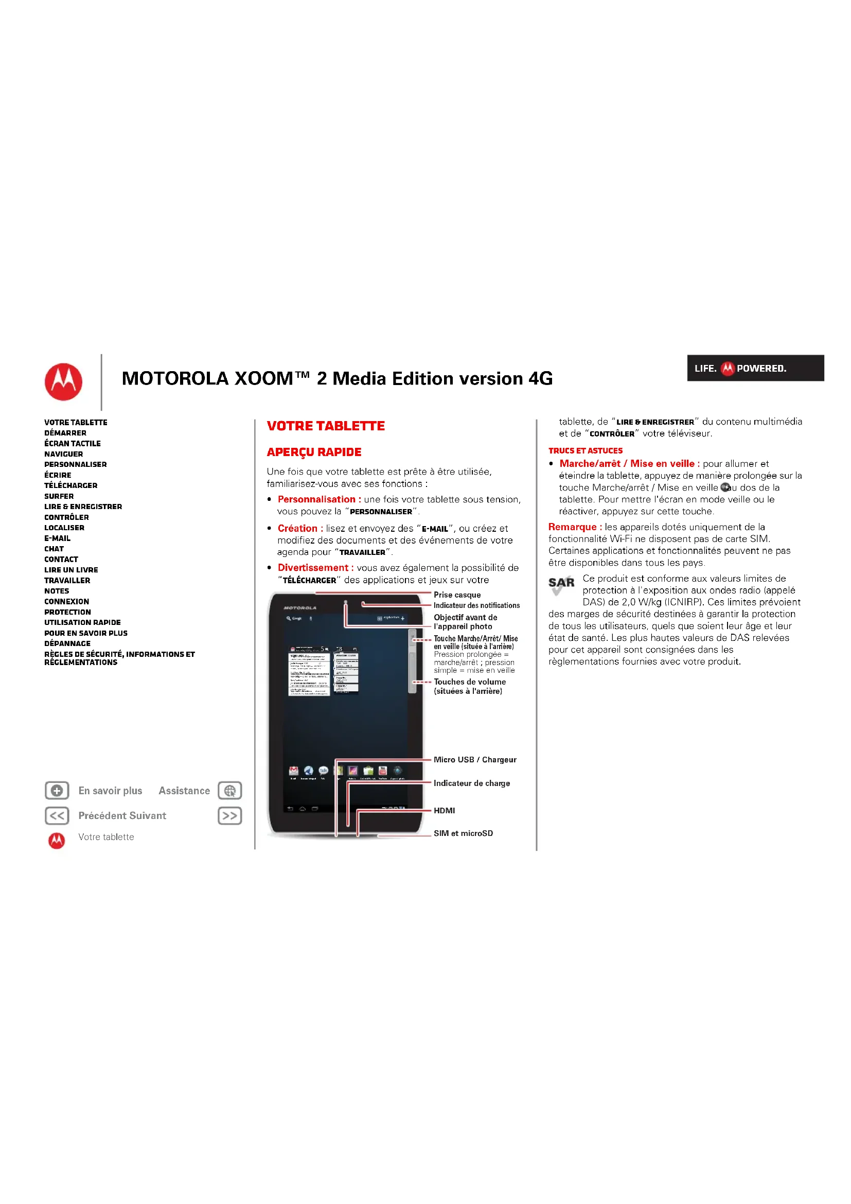 MOTOROLA XOOM™ 2 Media Edition version 4G Votre tabletteDémarrerÉcran tactileNaviguerPersonnaliserÉcrireTéléchargerSurferLire & enregistrerCONTRÔLERLocaliserE-mail Chat ContactLire un livreTravaillerNotesConnexionProtectionUtilisation rapidePour en savoir plusDépannageRègles de sécurité, informations et réglementationsRègles de sécurité, informations et réglementations Droits d'auteur et marques commerciales www.motorola.comCertains services, fonctionnalités et applications dépendent du réseau et peuvent ne pas être disponibles partout ; des termes, conditions et/ou tarifs particuliers pourront être appliqués. Pour plus de détails, adressez-vous à votre opérateur.Les fonctions, fonctionnalités, caractéristiques du produit et informations indiquées dans ce guide d’utilisation sont mises à jour et étaient exactes au moment de la mise sous presse. Motorola se réserve le droit de modifier ces informations sans préavis, ni obligation.Remarque : les images de ce guide sont fournies à titre d'exemple uniquement.MOTOROLA et le Logo M stylisé sont des marques commerciales ou marques déposées de Motorola Trademark Holdings, LLC. Google, le logo Google, Google Maps, Google Talk, Google Latitude, Gmail, YouTube, Picasa, Google Books, Google Docs, Google Goggles, Google Finance, Google Places, Google Maps Navigation Beta, Google Agenda, Android, Android Market et d'autres marques sont des marques déposées de Google, Inc. Les autres noms de produits et de services appartiennent à leurs propriétaires respectifs.© 2011 Motorola Mobility, Inc. Tous droits réservés.Attention : Motorola n'est pas responsable des modifications apportées à l'émetteur-récepteur.ID produit : MOTOROLA XOOM™ 2 Media Edition Wi-Fi (MZ607-16, MZ607-32)Référence du manuel : 68016581008LIFE. POWERED. Précédent Suivant En savoir plus Assistance