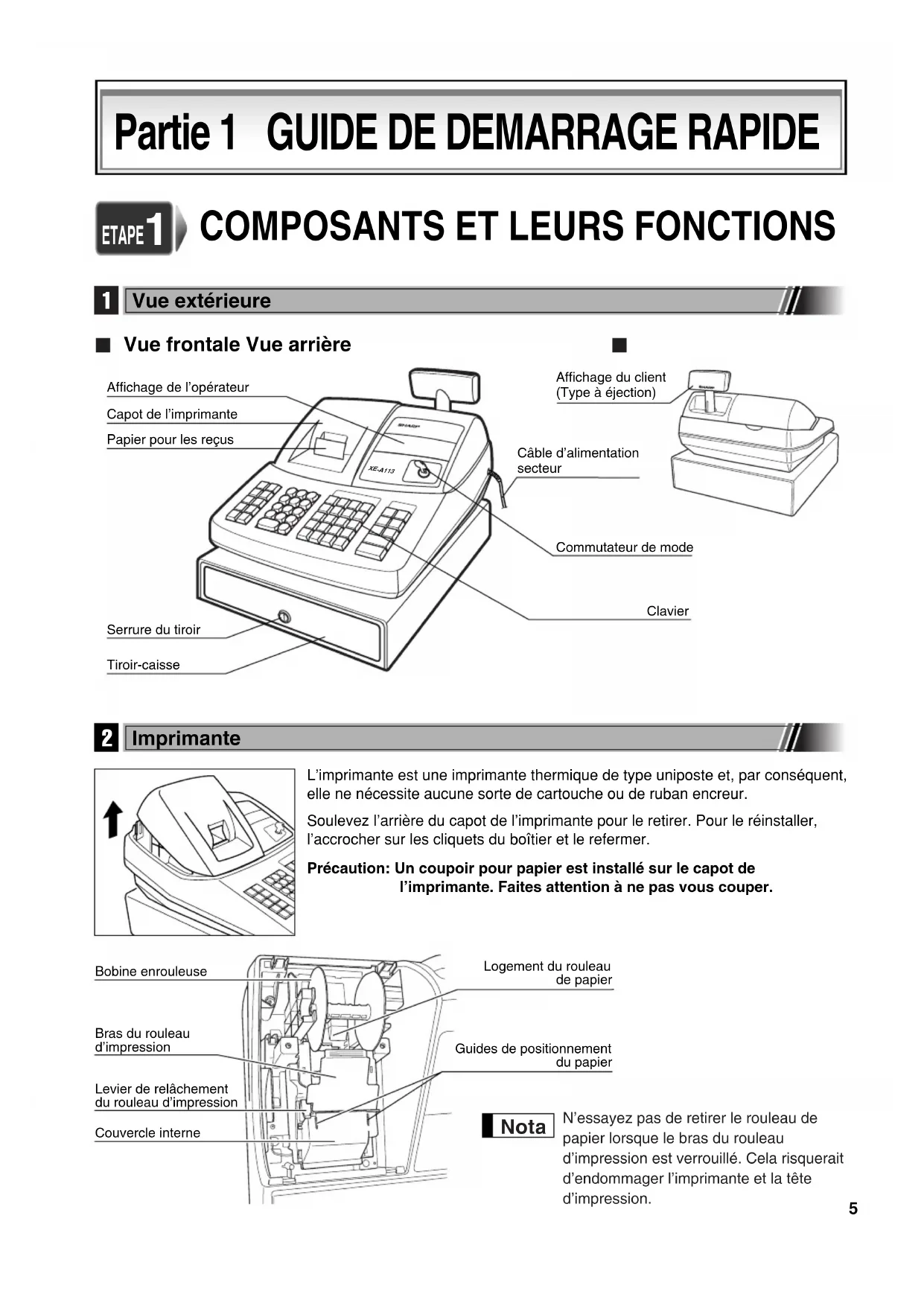 Vue frontale Vue arrièreL’imprimante est une imprimante thermique de type uniposte et, par conséquent,elle ne nécessite aucune sorte de cartouche ou de ruban encreur.Soulevez l’arrière du capot de l’imprimante pour le retirer. Pour le réinstaller,l’accrocher sur les cliquets du boîtier et le refermer.Précaution: Un coupoir pour papier est installé sur le capot del’imprimante. Faites attention à ne pas vous couper. Bobine enrouleuseLevier de relâchement du rouleau d’impressionBras du rouleau d’impressionCouvercle interneLogement du rouleaude papierGuides de positionnementdu papier