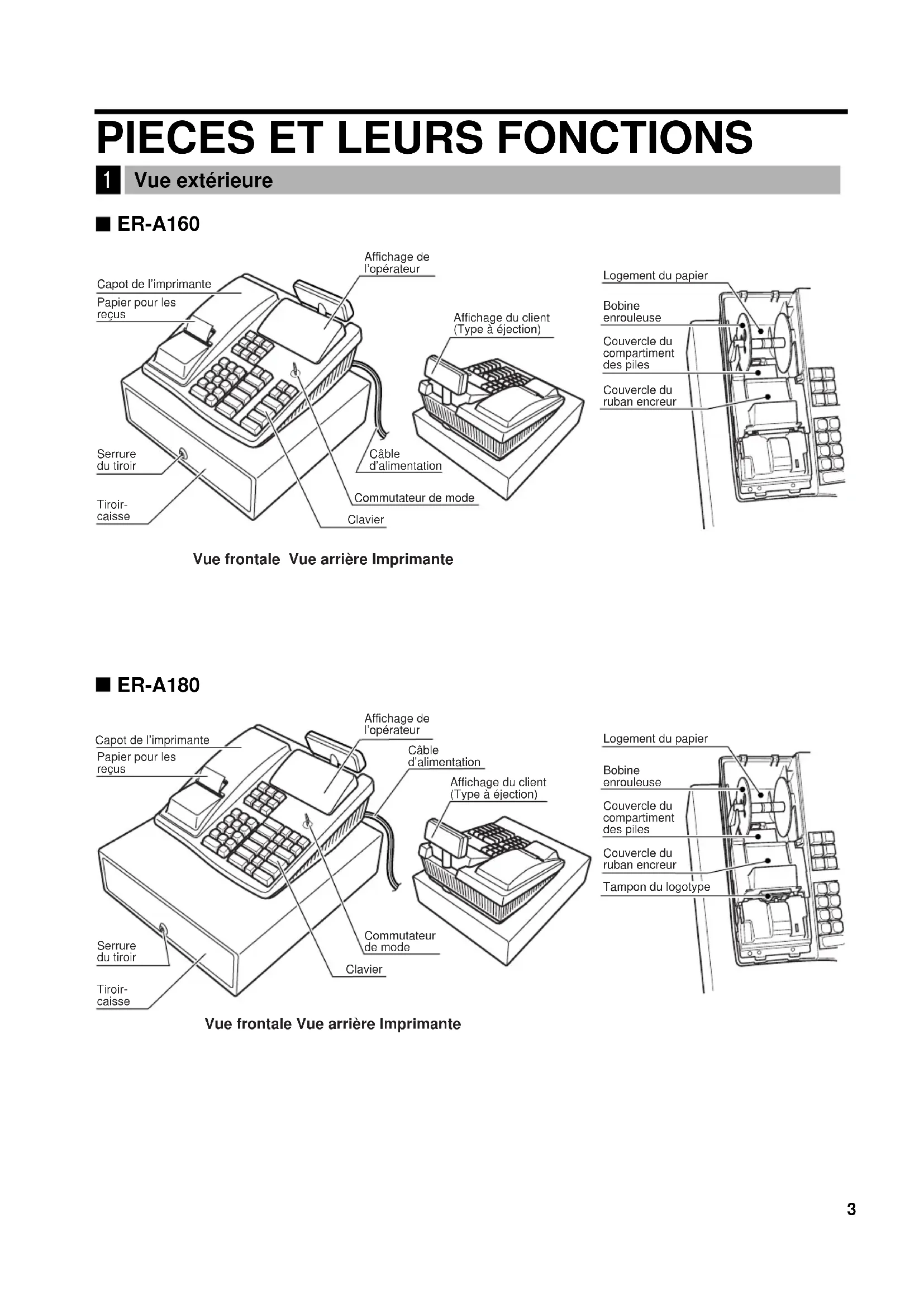 Serrure du tiroirTiroir-caisseCapot de l’imprimanteCommutateur de modeCâble d’alimentationClavierCouvercle du compartiment des pilesBobine enrouleuseCouvercle du ruban encreurAffichage du client (Type à éjection) Vue frontale Vue arrière Imprimante Papier pour les reçusAffichage de l’opérateurLogement du papier Affichage de l’opérateurSerrure du tiroirTiroir-caisseCapot de l’imprimanteCommutateur de modeCâble d’alimentationClavierCouvercle du compartiment des pilesLogement du papierBobine enrouleuseCouvercle du ruban encreurAffichage du client (Type à éjection) Vue frontale Vue arrière Imprimante Tampon du logotypePapier pour les reçus4 Disposition du clavier standard ER-A160 ER-A180 Noms des touches standards Touches optionnelles Vous pouvez modifier le nombre de rayons à 10 ou 15 (ER-A160), ou à 5, 15, 20 ou 30 (ER-A180). Les dispositions des touches de 15, 20 ou 30 rayons sont les suivantes. (Les dispositions de 5 et de 10 rayons sont montrées ci-dessous.) Consultez votre revendeur pour le changement du nombre de rayons. 15 rayons 20 rayons 30 rayons