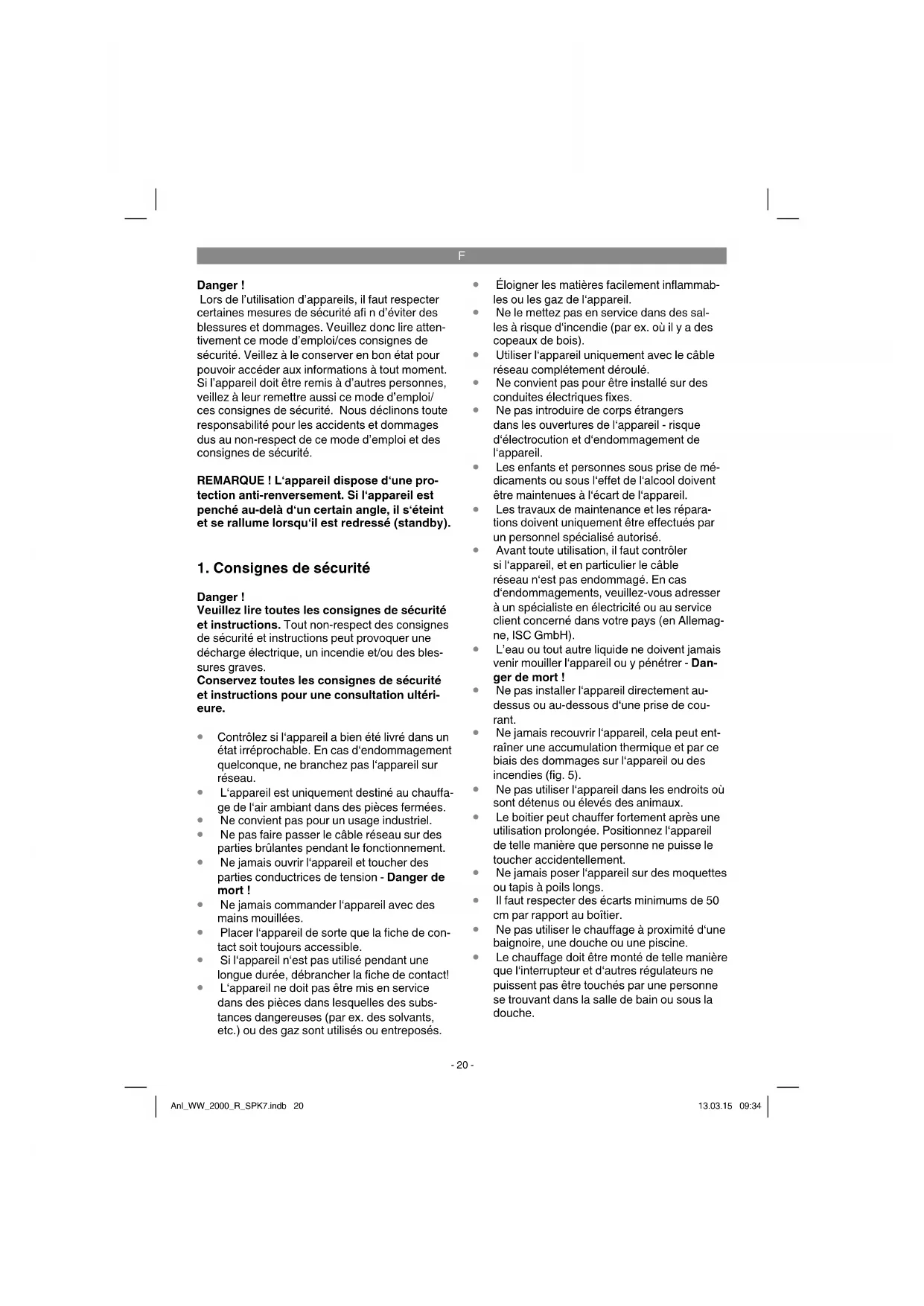 Danger ! Lors de l’utilisation d’appareils, il faut respecter certaines mesures de sécurité afi n d’éviter des blessures et dommages. Veuillez donc lire atten- tivement ce mode d’emploi/ces consignes de sécurité. Veillez à le conserver en bon état pour pouvoir accéder aux informations à tout moment. Si l’appareil doit être remis à d’autres personnes, veillez à leur remettre aussi ce mode d’emploi/ ces consignes de sécurité. Nous déclinons toute responsabilité pour les accidents et dommages dus au non-respect de ce mode d’emploi et des consignes de sécurité. REMARQUE ! L‘appareil dispose d‘une pro- tection anti-renversement. Si l‘appareil est penché au-delà d‘un certain angle, il s‘éteint et se rallume lorsqu‘il est redressé (standby).