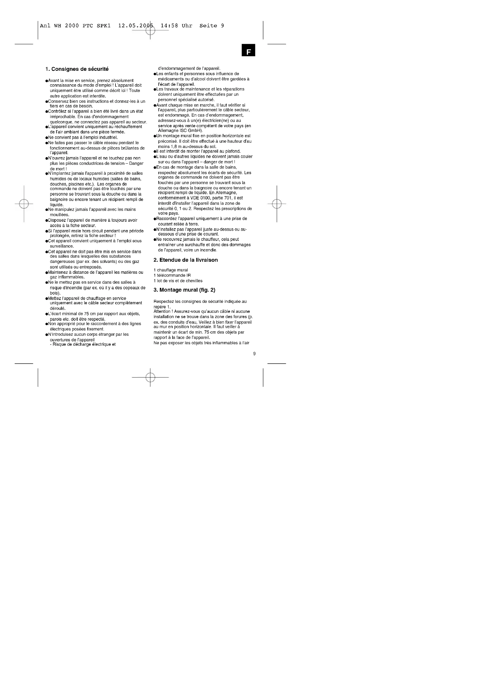 Respectez les consignes de sécurité indiquée au repère 1. Attention ! Assurez-vous qu’aucun câble ni aucune installation ne se trouve dans la zone des forures (p. ex. des conduits d’eau. Veillez à bien fixer l’appareil au mur en position horizontale. Il faut veiller à maintenir un écart de min. 75 cm des objets par rapport à la face de l’appareil. Ne pas exposer les objets très inflammables à l’air Anl WH 2000 PTC SPK1 12.05.2005 14:58 Uhr Seite 910