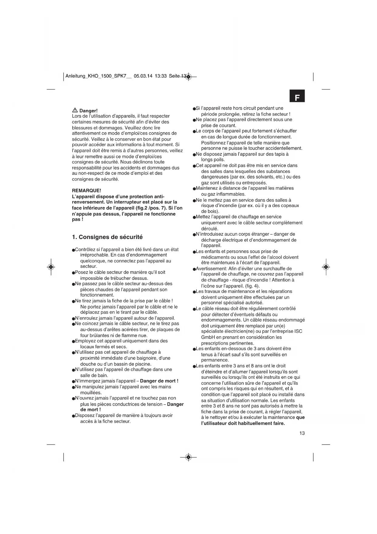 Anleitung_KHO_1500_SPK7__ 05.03.14 13:33 Seite 13n Attention - Quelques pièces du produit peuvent être très brûlantes et causer des brûlures. Soyez particulièrement prudent lorsque des enfants et des personnes fragiles sont présents. Danger! Veuillez lire toutes les consignes de sécurité et instructions. Tout non-respect des consignes de sécurité et instructions peut provoquer une décharge électrique, un incendie et/ou des blessures graves. Conservez toutes les consignes de sécurité et toutes les instructions pour l’avenir.