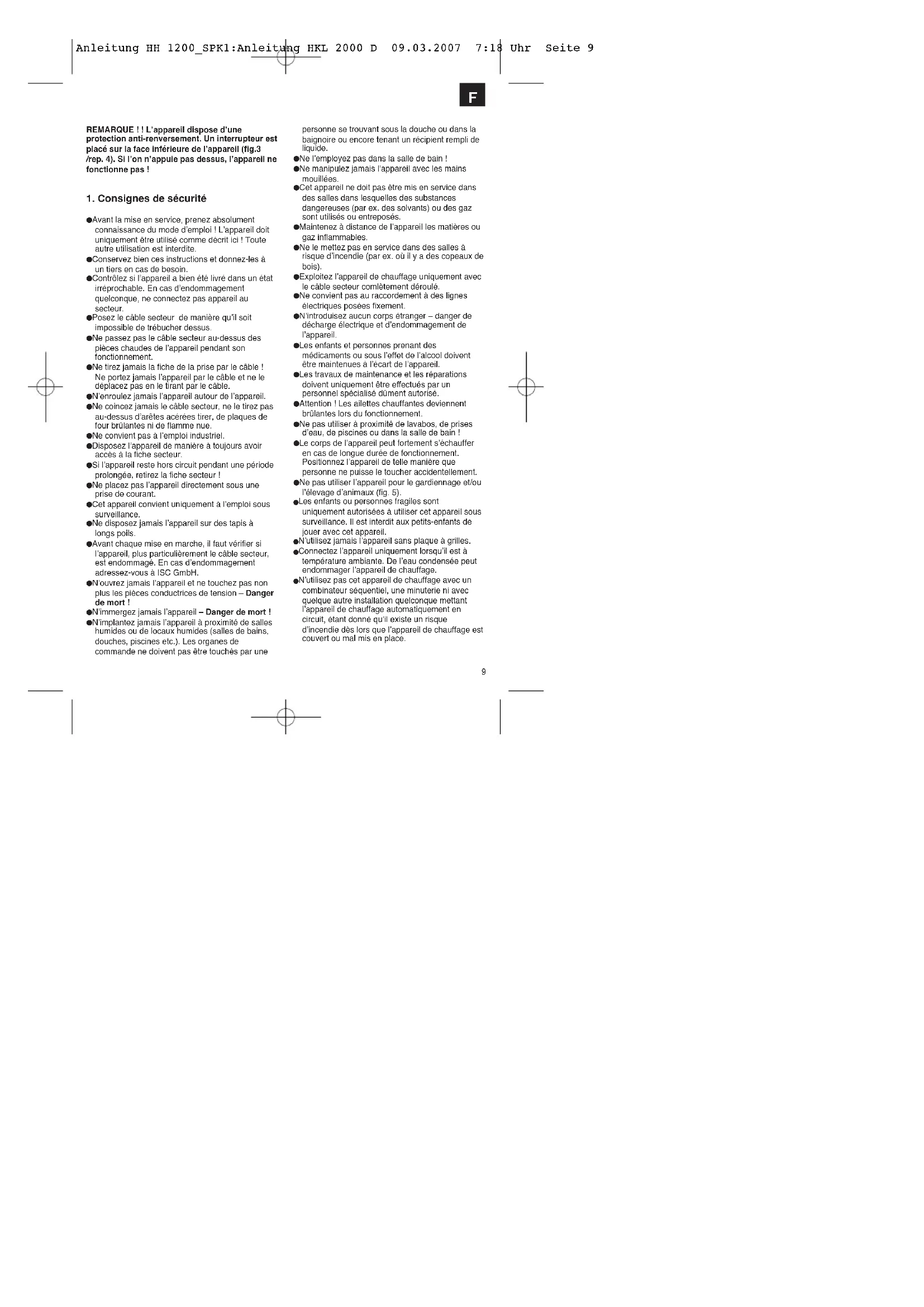 앬 Avant la mise en service, prenez absolument connaissance du mode dʼemploi ! Lʼappareil doit uniquement être utilisé comme décrit ici ! Toute autre utilisation est interdite. 앬 Conservez bien ces instructions et donnez-les à un tiers en cas de besoin. 앬 Contrôlez si lʼappareil a bien été livré dans un état irréprochable. En cas dʼendommagement quelconque, ne connectez pas appareil au secteur. 앬 Posez le câble secteur de manière quʼil soit impossible de trébucher dessus. 앬 Ne passez pas le câble secteur au-dessus des pièces chaudes de lʼappareil pendant son fonctionnement. 앬 Ne tirez jamais la fiche de la prise par le câble ! Ne portez jamais lʼappareil par le câble et ne le déplacez pas en le tirant par le câble. 앬 Nʼenroulez jamais lʼappareil autour de lʼappareil. 앬 Ne coincez jamais le câble secteur, ne le tirez pas au-dessus dʼarêtes acérées tirer, de plaques de four brûlantes ni de flamme nue. 앬 Ne convient pas à lʼemploi industriel. 앬 Disposez lʼappareil de manière à toujours avoir accès à la fiche secteur. 앬 Si lʼappareil reste hors circuit pendant une période prolongée, retirez la fiche secteur ! 앬 Ne placez pas lʼappareil directement sous une prise de courant. 앬 Cet appareil convient uniquement à lʼemploi sous surveillance. 앬 Ne disposez jamais lʼappareil sur des tapis à longs poils. 앬 Avant chaque mise en marche, il faut vérifier si lʼappareil, plus particulièrement le câble secteur, est endommagé. En cas dʼendommagement adressez-vous à ISC GmbH. 앬 Nʼouvrez jamais lʼappareil et ne touchez pas non plus les pièces conductrices de tension – Danger de mort ! 앬 Nʼimmergez jamais lʼappareil – Danger de mort ! 앬 Nʼimplantez jamais lʼappareil à proximité de salles humides ou de locaux humides (salles de bains, douches, piscines etc.). Les organes de commande ne doivent pas être touchés par une personne se trouvant sous la douche ou dans la baignoire ou encore tenant un récipient rempli de liquide. 앬 Ne lʼemployez pas dans la salle de bain ! 앬 Ne manipulez jamais lʼappareil avec les mains mouillées. 앬 Cet appareil ne doit pas être mis en service dans des salles dans lesquelles des substances dangereuses (par ex. des solvants) ou des gaz sont utilisés ou entreposés. 앬 Maintenez à distance de lʼappareil les matières ou gaz inflammables. 앬 Ne le mettez pas en service dans des salles à risque dʼincendie (par ex. où il y a des copeaux de bois). 앬 Exploitez lʼappareil de chauffage uniquement avec le câble secteur comlètement déroulé. 앬 Ne convient pas au raccordement à des lignes électriques posées fixement. 앬 Nʼintroduisez aucun corps étranger – danger de décharge électrique et dʼendommagement de lʼappareil. 앬 Les enfants et personnes prenant des médicaments ou sous lʼeffet de lʼalcool doivent être maintenues à lʼécart de lʼappareil. 앬 Les travaux de maintenance et les réparations doivent uniquement être effectués par un personnel spécialisé dûment autorisé. 앬 Attention ! Les ailettes chauffantes deviennent brûlantes lors du fonctionnement. 앬 Ne pas utiliser à proximité de lavabos, de prises dʼeau, de piscines ou dans la salle de bain ! 앬 Le corps de lʼappareil peut fortement sʼéchauffer en cas de longue durée de fonctionnement. Positionnez lʼappareil de telle manière que personne ne puisse le toucher accidentellement. 앬 Ne pas utiliser lʼappareil pour le gardiennage et/ou lʼélevage dʼanimaux (fig. 5). Les enfants ou personnes fragiles sont uniquement autorisées à utiliser cet appareil sous surveillance. Il est interdit aux petits-enfants de jouer avec cet appareil. Nʼutilisez jamais lʼappareil sans plaque à grilles. Connectez lʼappareil uniquement lorsquʼil est à température ambiante. De lʼeau condensée peut endommager lʼappareil de chauffage. Nʼutilisez pas cet appareil de chauffage avec un combinateur séquentiel, une minuterie ni avec quelque autre installation quelconque mettant lʼappareil de chauffage automatiquement en circuit, étant donné quʼil existe un risque dʼincendie dès lors que lʼappareil de chauffage est couvert ou mal mis en place.