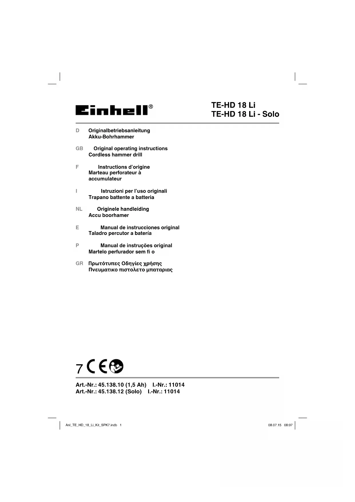 Retrouvez gratuitement la notice de l'appareil TEHD 18 Li EINHELL au format PDF.