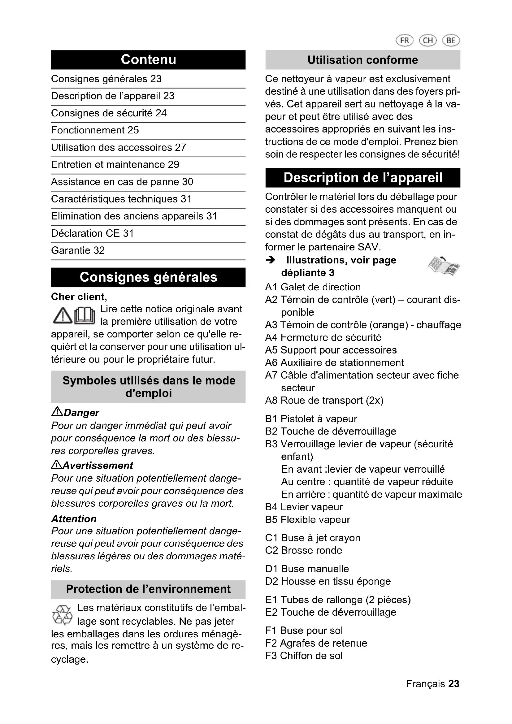 Warranty Warranty card Company and seller's headquarters: Service address: Phone hotline: Email Name of manufacturer/importer: Product name: Product/manufacturer ID no.: Buyer's name: Postal Code/City: Street: Phone/E-mail: Signature: Fault description:Français 23 Cher client, Lire cette notice originale avant la première utilisation de votre appareil, se comporter selon ce qu'elle re- quièrt et la conserver pour une utilisation ul- térieure ou pour le propriétaire futur. Danger Pour un danger immédiat qui peut avoir pour conséquence la mort ou des blessu- res corporelles graves. 몇 Avertissement Pour une situation potentiellement dange- reuse qui peut avoir pour conséquence des blessures corporelles graves ou la mort. Attention Pour une situation potentiellement dange- reuse qui peut avoir pour conséquence des blessures légères ou des dommages maté- riels. Les matériaux constitutifs de l’embal- lage sont recyclables. Ne pas jeter les emballages dans les ordures ménagè- res, mais les remettre à un système de re- cyclage. Ce nettoyeur à vapeur est exclusivement destiné à une utilisation dans des foyers pri- vés. Cet appareil sert au nettoyage à la va- peur et peut être utilisé avec des accessoires appropriés en suivant les ins- tructions de ce mode d'emploi. Prenez bien soin de respecter les consignes de sécurité! Contrôler le matériel lors du déballage pour constater si des accessoires manquent ou si des dommages sont présents. En cas de constat de dégâts dus au transport, en in- former le partenaire SAV. Î Illustrations, voir page dépliante 3 Contenu Consignes générales 23 Description de l’appareil 23 Consignes de sécurité 24 Fonctionnement 25 Utilisation des accessoires 27 Entretien et maintenance 29 Assistance en cas de panne 30 Caractéristiques techniques 31 Elimination des anciens appareils 31 Déclaration CE 31 Garantie 32 Consignes générales Symboles utilisés dans le mode d'emploi Protection de l’environnement Utilisation conforme Description de l’appareil A1 Galet de direction A2 Témoin de contrôle (vert) – courant dis- ponible A3 Témoin de contrôle (orange) - chauffage A4 Fermeture de sécurité A5 Support pour accessoires A6 Auxiliaire de stationnement A7 Câble d'alimentation secteur avec fiche secteur A8 Roue de transport (2x) B1 Pistolet à vapeur B2 Touche de déverrouillage B3 Verrouillage levier de vapeur (sécurité enfant) En avant :levier de vapeur verrouillé Au centre : quantité de vapeur réduite En arrière : quantité de vapeur maximale B4 Levier vapeur B5 Flexible vapeur C1 Buse à jet crayon C2 Brosse ronde D1 Buse manuelle D2 Housse en tissu éponge E1 Tubes de rallonge (2 pièces) E2 Touche de déverrouillage F1 Buse pour sol F2 Agrafes de retenue F3 Chiffon de sol24 Français Î Illustrations voir page 2 1 Dévisser la fermeture de sécurité (A4) et verser au moins 0,2 litre et au maxi- mum 1,0 litre d'eau dans le nettoyeur à vapeur. 2 Visser la fermeture de sécurité. 3 Brancher la fiche secteur (A7) dans une prise de courant. Les deux lampes témoin (A2/A3) doi- vent être allumées. 4 Attendre environ 7 minutes que le té- moin de contrôle orange (A3) s'éteigne. 5 Raccorder l’accessoire nécessaire au pistolet à vapeur (B1). Le nettoyeur à vapeur est opérationnel. Danger Il est interdit d’utiliser l’appareil dans des zones présentant des risques d’ex- plosion. Si l’appareil est utilisé dans des zones dangereuses, tenir compte des consi- gnes de sécurité correspondantes. Ne pas utiliser l'appareil dans des pisci- nes qui contiennent de l'eau. L'appareil ne doit pas être utilisé pour le nettoyage d'appareils électriques, par ex. fours, hottes d'aspiration, fours à microondes, téléviseurs, lampes, sè- ches-cheveux, chauffages électriques, etc. Avant l’utilisation, vérifier que l'appareil et les accessoires sont en parfait état. Ne pas utiliser l'appareil si son état n'est pas irréprochable. Contrôler en particu- lier les câbles d'alimentation secteur (A7), le verrouillage de sécurité (A4) et le flexible de vapeur (B5). Un câble d’alimentation endommagé doit immédiatement être remplacé par le service après-vente ou un électricien agréé. Un flexible de vapeur endommagé doit immédiatement être remplacé. Utiliser uniquement le flexible vapeur recom- mandé par le fabricant. Ne jamais saisir la fiche secteur ni la pri- se de courant avec des mains humides. Ne jamais pulvériser de vapeur sur des objets contenant des substances toxi- ques (par exemple de l’amiante). Ne jamais approcher la main du jet de vapeur, ou diriger celui-ci sur des per- sonnes ou des animaux (risque de brû- lure). 몇 Avertissement L’appareil doit uniquement être raccor- dé à un branchement électrique mis en service par un électricien conformé- ment à la norme IEC 60364. L'appareil doit être raccordé unique- ment au courant alternatif. La tension doit être identique avec celle indiquée sur la plaque signalétique de l’appareil. Dans les pièces humides, telles que les salles de bain, exploiter l'appareil uni- quement s'il est raccordé à une prise munie d'un disjoncteur de protection FI placé en amont. Des rallonges non adaptées peuvent présenter des risques. Utiliser unique- ment un câble de rallonge doté d'une protection anti-éclaboussures et d'une section transversale de 3x1 mm² au mi- nimum. Le raccord entre la fiche électrique et le câble de rallonge ne doit jamais se trou- ver dans l’eau. En cas de remplacement des raccords du câble d'alimentation ou de la rallon- ge, s'assurer que la protection anti- éclaboussures et la résistance mécani- que ne sont pas compromises. L’utilisateur doit faire preuve d'un usage conforme de l'appareil. Il doit prendre en considération les données locales et lors du maniement de l’appareil, il doit prendre garde aux tierces personnes, et en particulier aux enfants. Cet appareil n'est pas conçu pour êtr