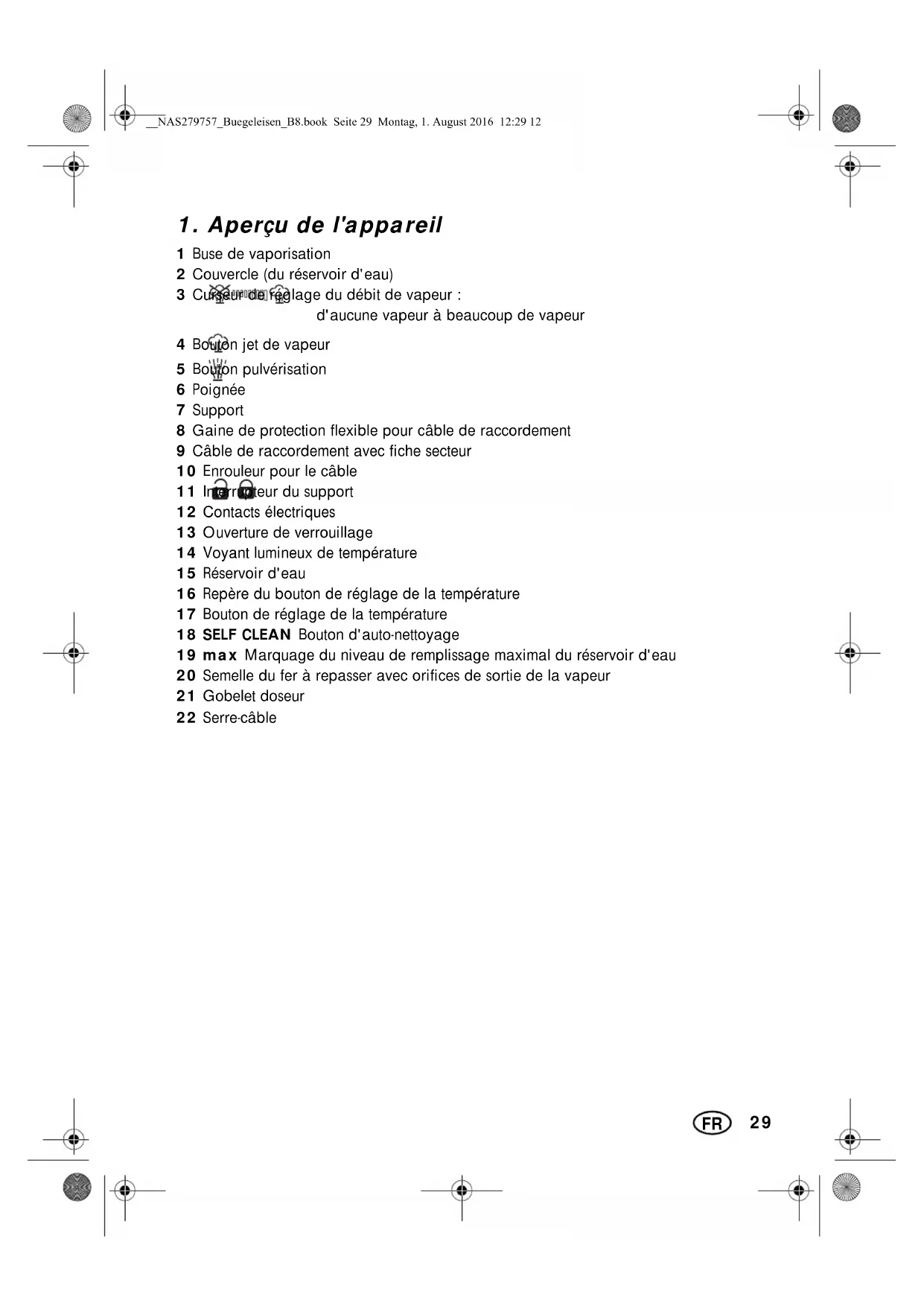 1 Buse de vaporisation 2 Couvercle (du réservoir d'eau) 3 Curseur de réglage du débit de vapeur : d'aucune vapeur à beaucoup de vapeur 4 Bouton jet de vapeur 5 Bouton pulvérisation 6 Poignée 7 Support 8 Gaine de protection flexible pour câble de raccordement 9 Câble de raccordement avec fiche secteur 10 Enrouleur pour le câble 11 Interrupteur du support 12 Contacts électriques 13 Ouverture de verrouillage 14 Voyant lumineux de température 15 Réservoir d'eau 16 Repère du bouton de réglage de la température 17 Bouton de réglage de la température 18 SELF CLEAN Bouton d'auto-nettoyage 19 max Marquage du niveau de remplissage maximal du réservoir d'eau 20 Semelle du fer à repasser avec orifices de sortie de la vapeur 21 Gobelet doseur 22 Serre-câble BB1$6B%XHJHOHLVHQB%ERRN6HLWH0RQWDJ$XJXVW30