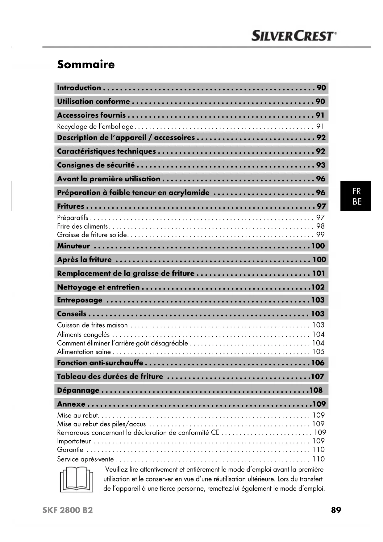 - Service après-vente Veuillez lire attentivement et entièrement le mode d’emploi avant la première utilisation et le conserver en vue d’une réutilisation ultérieure. Lors du transfert de l’appareil à une tierce personne, remettez-lui également le mode d’emploi. IB_107216_SKF2800B2_FI_SE_DK_BE_NL.indb 89 23.01.15 12:2090 p. 110