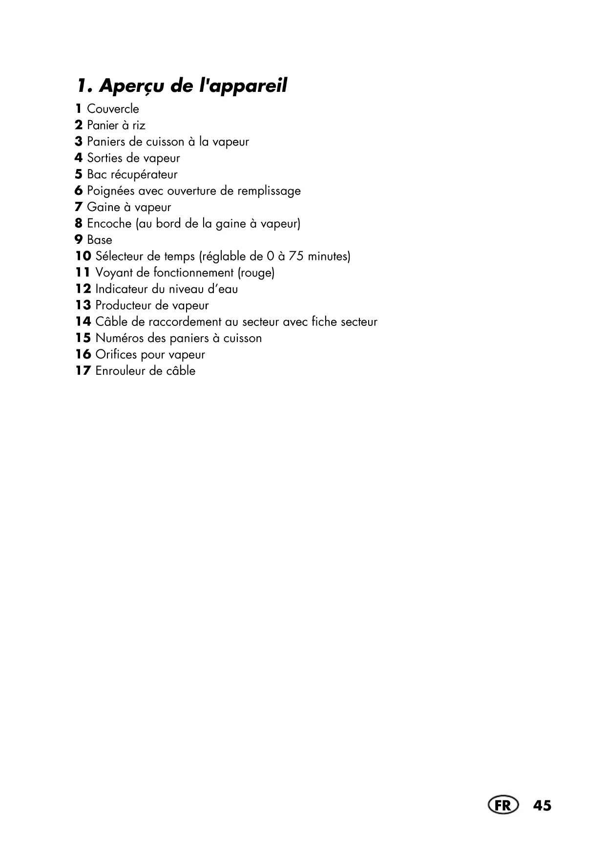 1 Couvercle 2 Panier à riz 3 Paniers de cuisson à la vapeur 4 Sorties de vapeur 5 Bac récupérateur 6 Poignées avec ouverture de remplissage 7 Gaine à vapeur 8 Encoche (au bord de la gaine à vapeur) 9 Base 10 Sélecteur de temps (réglable de 0 à 75 minutes) 11 Voyant de fonctionnement (rouge) 12 Indicateur du niveau d’eau 13 Producteur de vapeur 14 Câble de raccordement au secteur avec fiche secteur 15 Numéros des paniers à cuisson 16 Orifices pour vapeur 17 Enrouleur de câble __340677_2004_Dampfgarer_B8.book Seite 45 Montag, 22. Juni 2020 1:29 1346