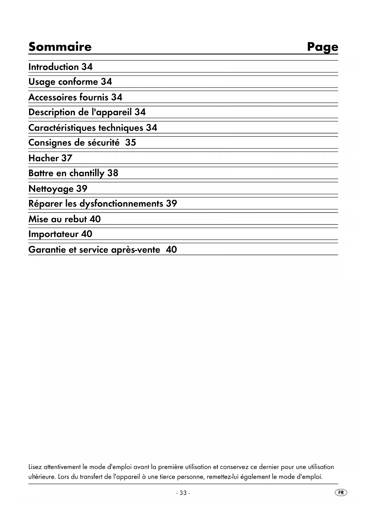 , 50 Hz Puissance nominale : 260 W Temps d'opération par intermittence : 1 minute Classe de protection : II / Capacité du bol mixeur : 500 ml Niveau de remplissage max. : - Aliments : jusqu'à la marque de 300 ml - Liquides : 200 ml Temps d'opération par intermittence : Le temps d'opération par intermittence indique pen- dant combien de temps l'appareil peut être opéré, sans que le moteur ne surchauffe ou subisse de dommages. Après le temps d'opération par intermit- tence indiqué, l'appareil doit être éteint jusqu'à ce que le moteur se soit refroidi.- 35 - Consignes de sécurité Risque d'électrocution !