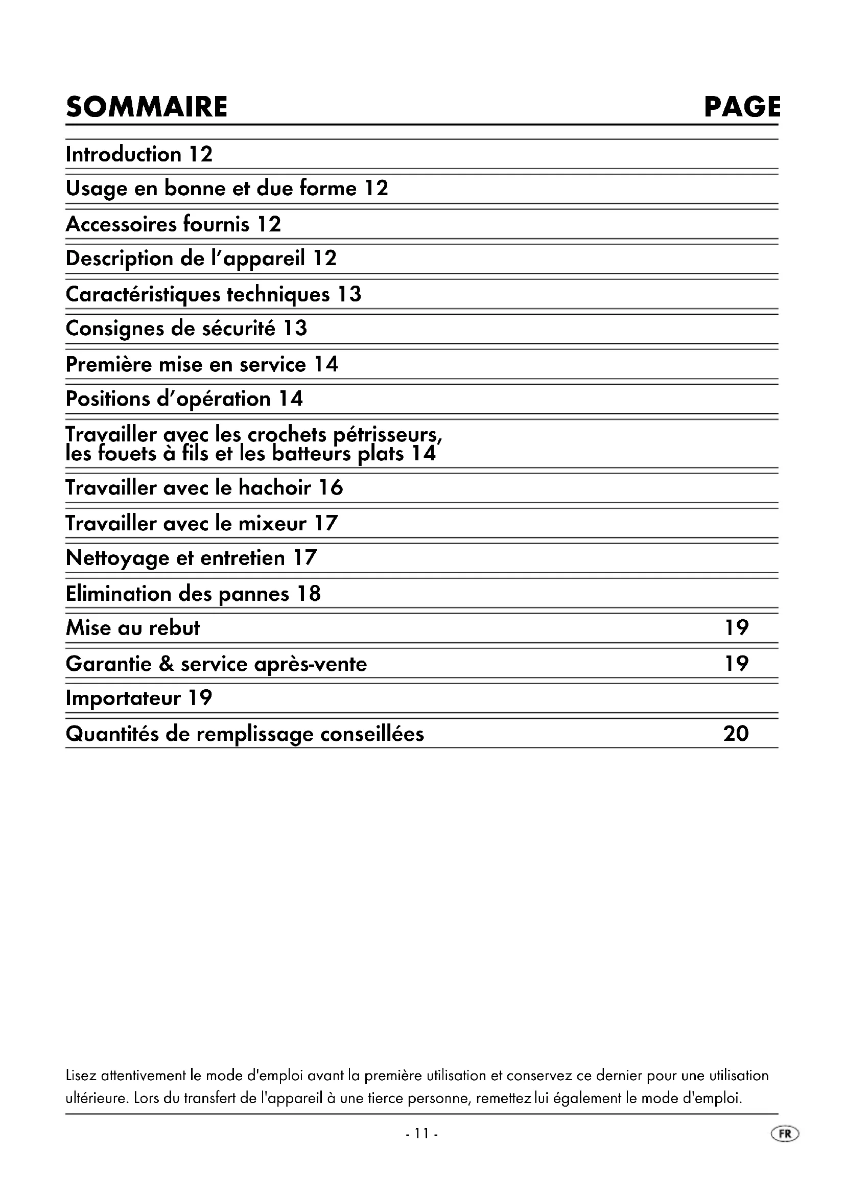6 min. 2, 3, 4 Eischnee 8 Eiweiße 2 3 min. 4 Schlagsahne (30% Fettgehalt) 600 ml ca. 3 min. 4- 11 - SOMMAIRE PAGE Introduction 12 Usage en bonne et due forme 12 Accessoires fournis 12 Description de l’appareil 12 Caractéristiques techniques 13 Consignes de sécurité 13 Première mise en service 14 Positions d’opération 14 Travailler avec les crochets pétrisseurs, les fouets à fils et les batteurs plats 14 Travailler avec le hachoir 16 Travailler avec le mixeur 17 Nettoyage et entretien 17 Elimination des pannes 18 Mise au rebut 19 Garantie & service après-vente 19 Importateur 19 Quantités de remplissage conseillées 20 Lisez attentivement le mode d'emploi avant la première utilisation et conservez ce dernier pour une utilisation ultérieure. Lors du transfert de l'appareil à une tierce personne, remettez lui également le mode d'emploi.- 12 -