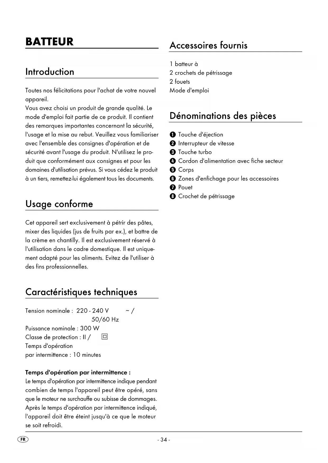 50/60 Hz Puissance nominale : 300 W Classe de protection : II / Temps d'opération par intermittence : 10 minutes Temps d'opération par intermittence : Le temps d'opération par intermittence indique pendant combien de temps l'appareil peut être opéré, sans que le moteur ne surchauffe ou subisse de dommages. Après le temps d'opération par intermittence indiqué, l'appareil doit être éteint jusqu'à ce que le moteur se soit refroidi. Accessoires fournis 1 batteur à 2 crochets de pétrissage 2 fouets Mode d'emploi Dénominations des pièces 1 Touche d'éjection 2 Interrupteur de vitesse 3 Touche turbo 4 Cordon d'alimentation avec fiche secteur 5 Corps 6 Zones d'enfichage pour les accessoires 7 Pouet 8 Crochet de pétrissage- 35 - Consignes de sécurité importantes Risque de choc électrique !