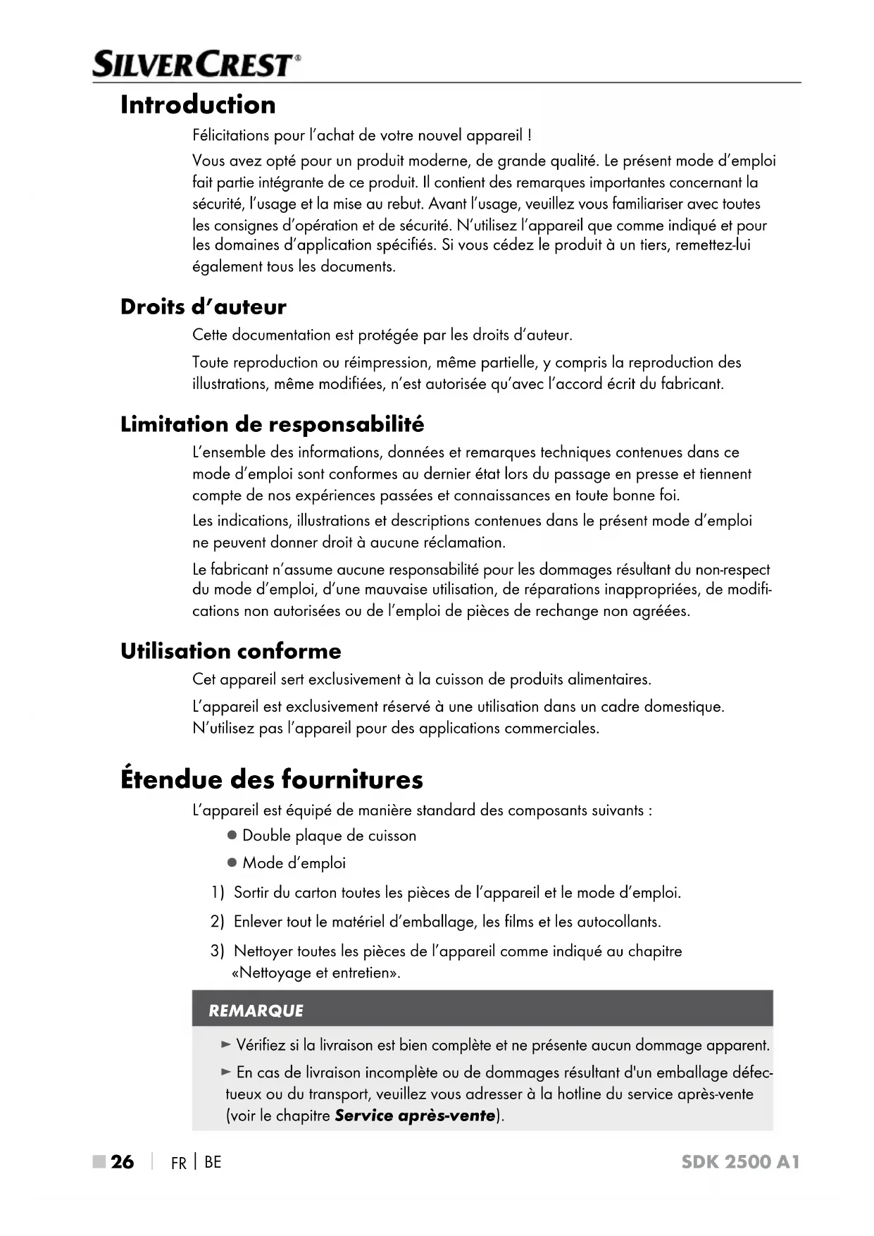 SDK 2500 A1 Introduction Félicitations pour l’achat de votre nouvel appareil ! Vous avez opté pour un produit moderne, de grande qualité. Le présent mode d’emploi fait partie intégrante de ce produit. Il contient des remarques importantes concernant la sécurité, l’usage et la mise au rebut. Avant l’usage, veuillez vous familiariser avec toutes les consignes d’opération et de sécurité. N’utilisez l’appareil que comme indiqué et pour les domaines d’application spécifiés. Si vous cédez le produit à un tiers, remettez-lui également tous les documents. Droits d’auteur Cette documentation est protégée par les droits d’auteur. Toute reproduction ou réimpression, même partielle, y compris la reproduction des illustrations, même modifiées, n’est autorisée qu’avec l’accord écrit du fabricant. Limitation de responsabilité L’ensemble des informations, données et remarques techniques contenues dans ce mode d’emploi sont conformes au dernier état lors du passage en presse et tiennent compte de nos expériences passées et connaissances en toute bonne foi. Les indications, illustrations et descriptions contenues dans le présent mode d’emploi ne peuvent donner droit à aucune réclamation. Le fabricant n’assume aucune responsabilité pour les dommages résultant du non-respect du mode d’emploi, d’une mauvaise utilisation, de réparations inappropriées, de modifi- cations non autorisées ou de l’emploi de pièces de rechange non agréées. Utilisation conforme Cet appareil sert exclusivement à la cuisson de produits alimentaires. L’appareil est exclusivement réservé à une utilisation dans un cadre domestique. N’utilisez pas l’appareil pour des applications commerciales. Étendue des fournitures L’appareil est équipé de manière standard des composants suivants : ▯ Double plaque de cuisson ▯ Mode d’emploi