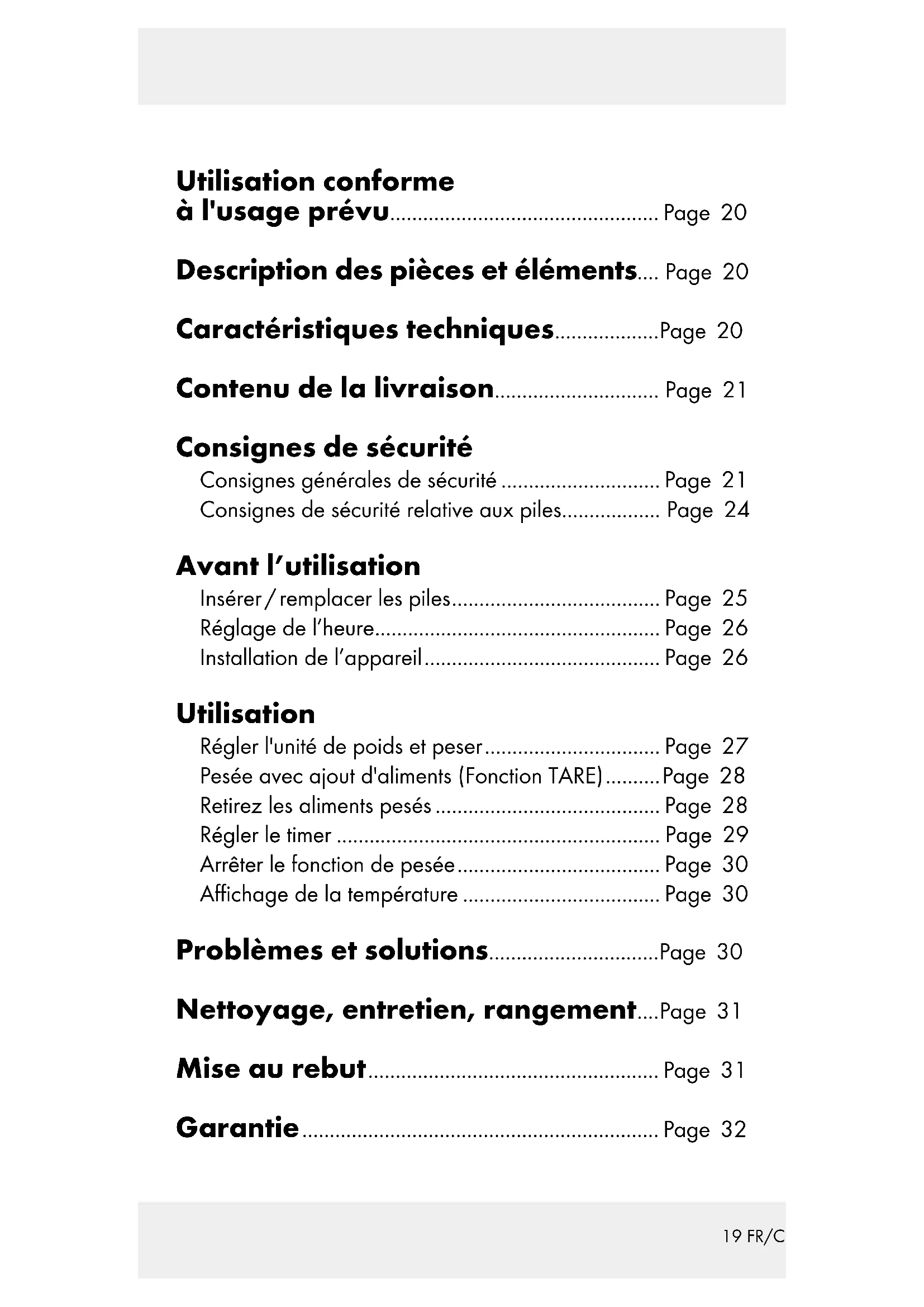 Compartiment à piles Caractéristiques techniques Alimentation en tension: 2 x 1,5 V AAA Affichage de la température: 0–40 °C, avec une tolérance de ±2 °C Plage de pesée: 0–5000 g, par étapes d'1 g21 FR/CH Contenu de la livraison 1 balance de cuisine digitale 2 piles 1,5 V AAA 1 mode d'emploi Consignes de sécurité