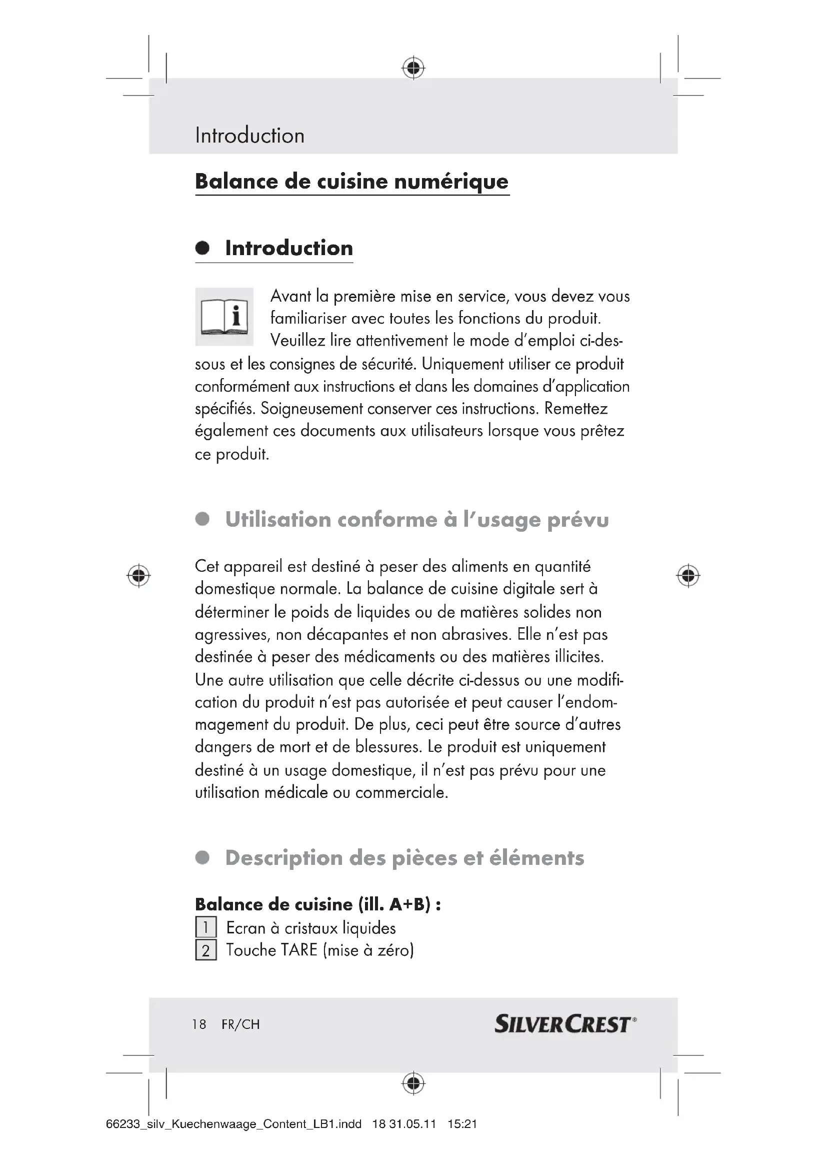 pour passer en mode de pesage. 66233_silv_Kuechenwaage_Content_LB1.indd 23 31.05.11 15:2124 FR/CH Utilisation Avis : Avant que la balance ne passe au mode de pesée, « HELO » est affiché pendant 1 à 2 secondes sur l’écran.